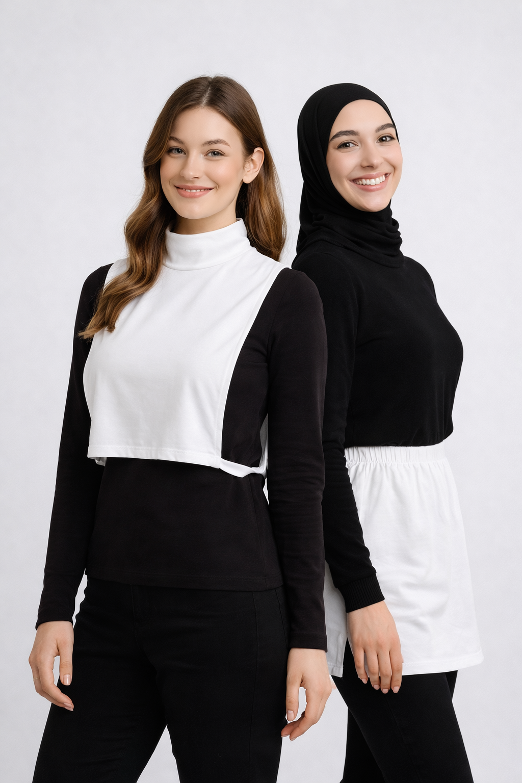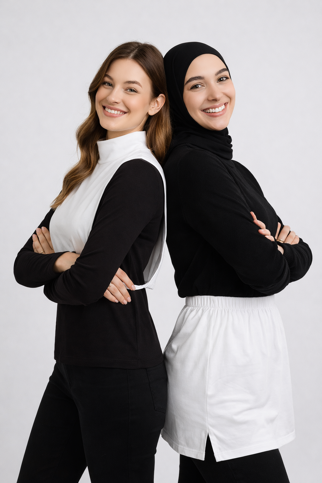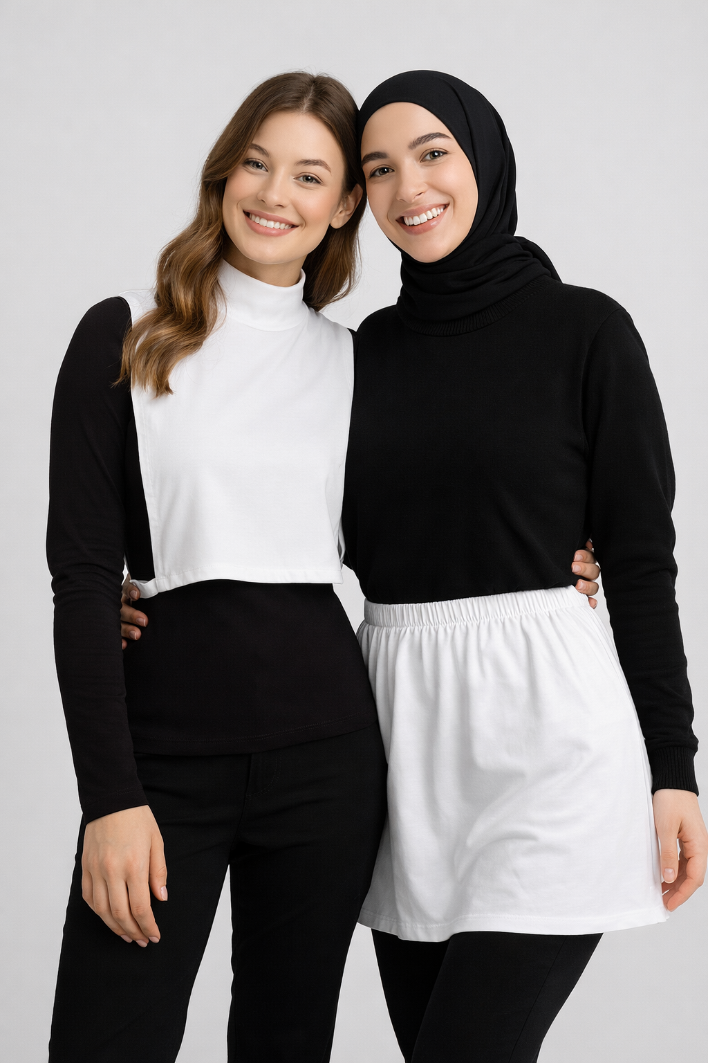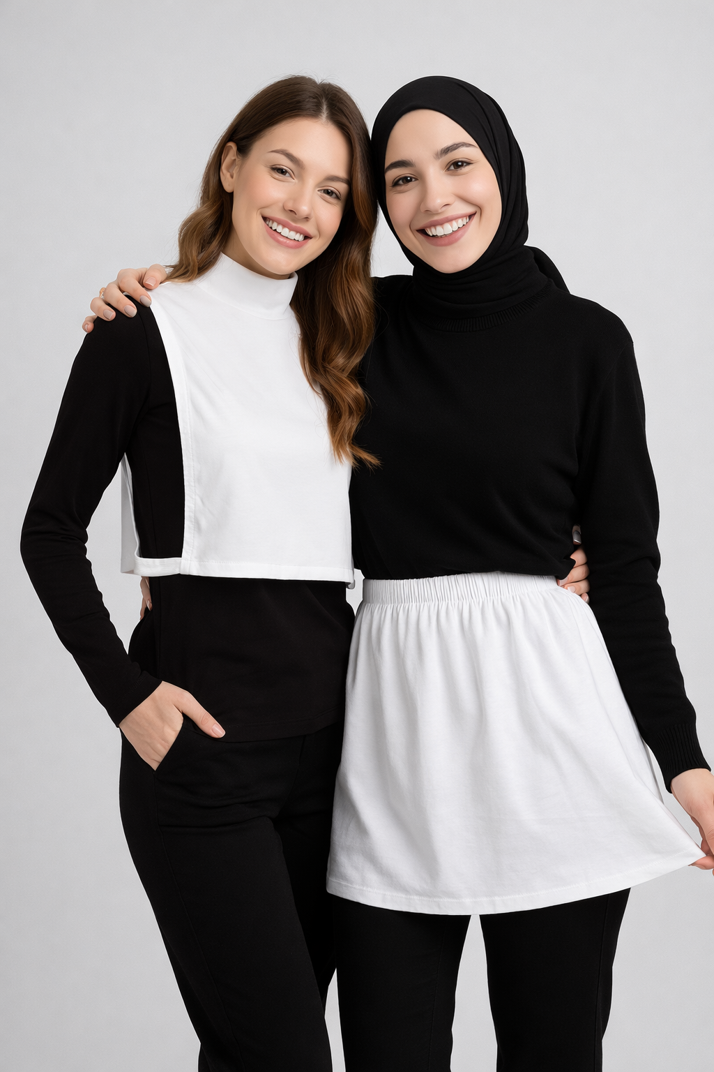 تُضفي هذه التنورة البيضاء والقلادة لمسةً من الأناقة العملية ، إذ تُغني عن الحاجة إلى تنسيق ملابس منفصلة. يُناسب هذا الطقم المكون من قطعتين الارتداء اليومي، وملابس العمل، والمناسبات الخاصة، وهو قطعة أساسية لكل من تبحث عن قطع متعددة الاستخدامات في عالم الأزياء المحتشمة.