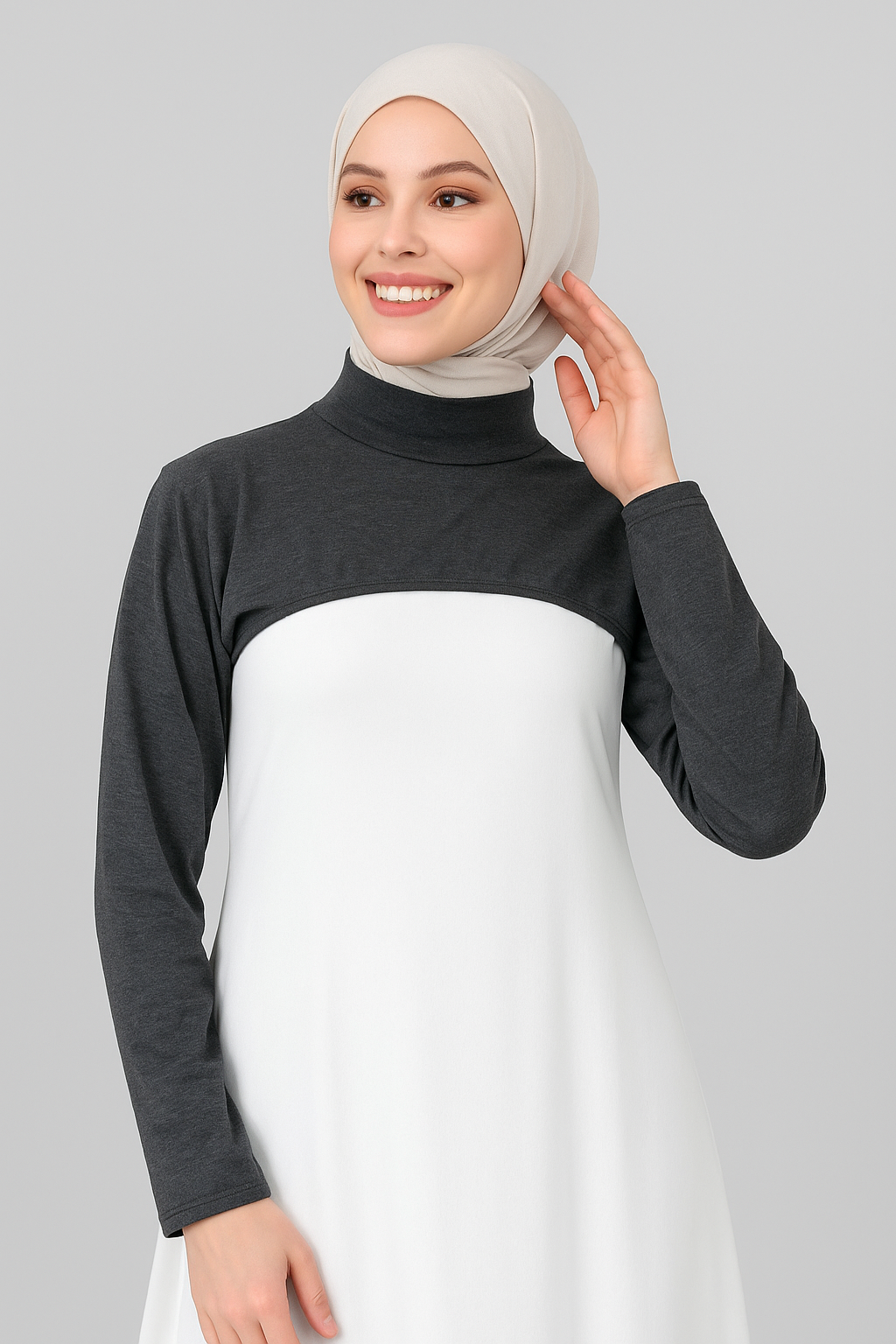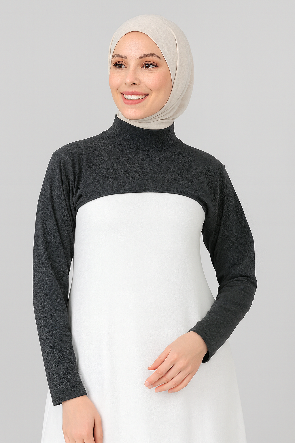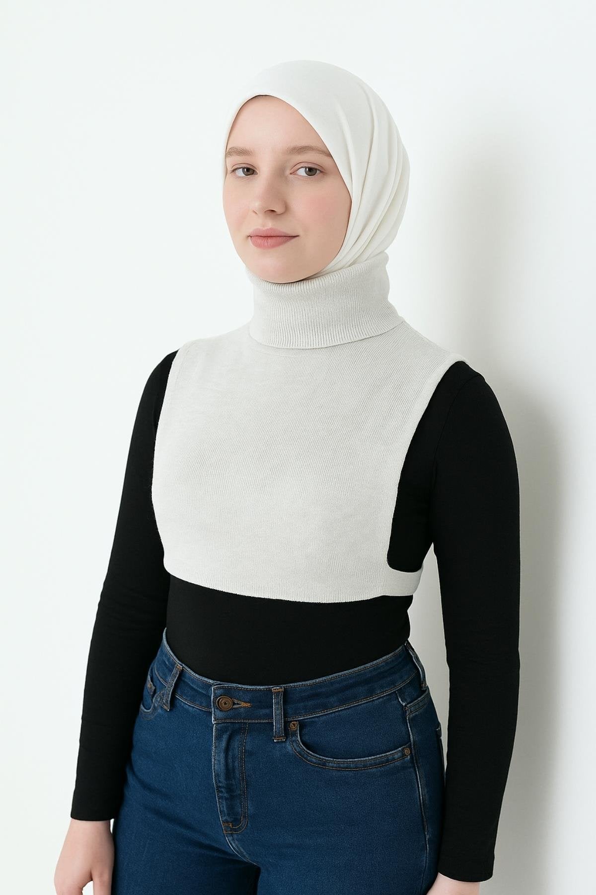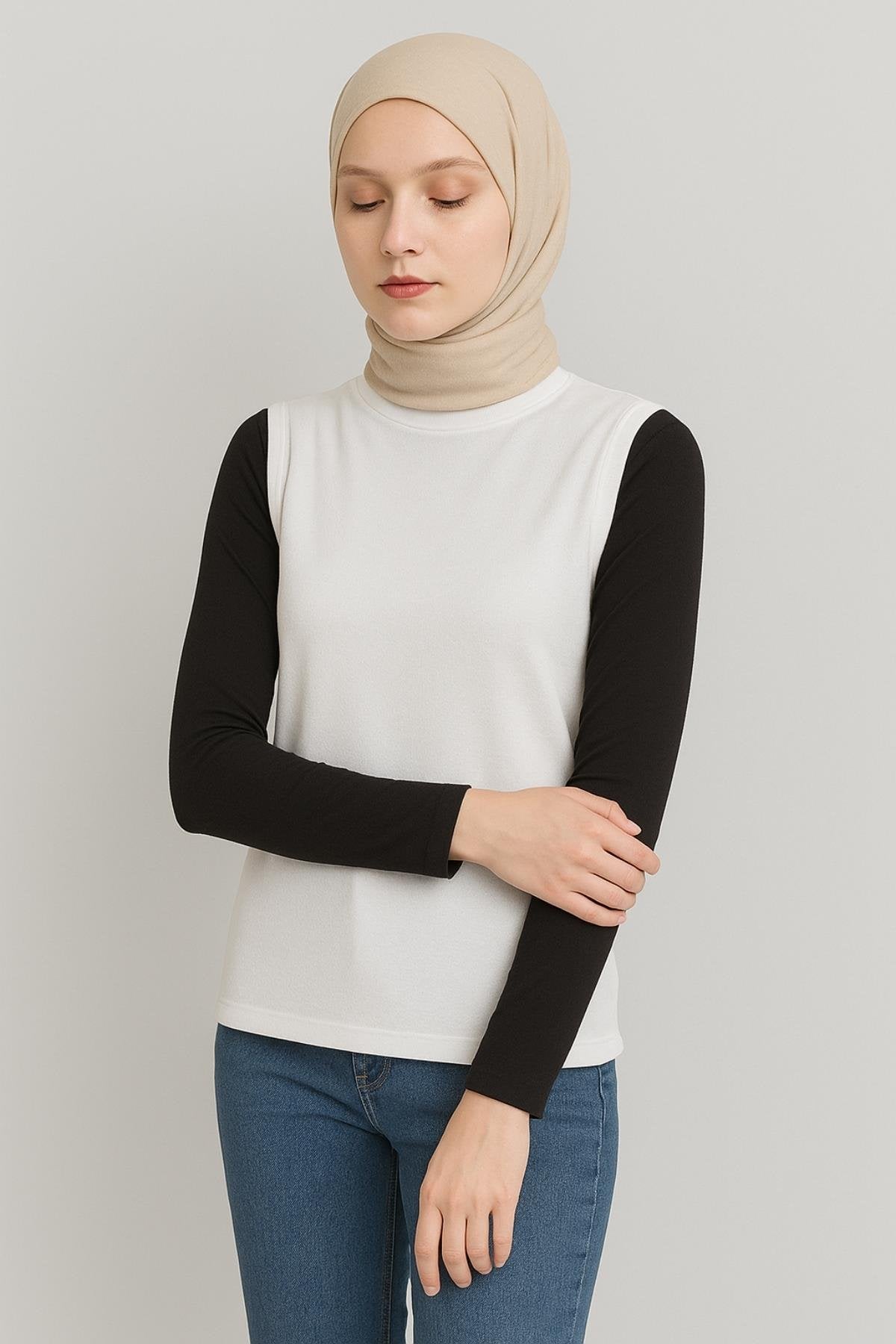 Bej Triko Tesettür Boyunluk - Balıkçı Yaka Yarım Atlet
