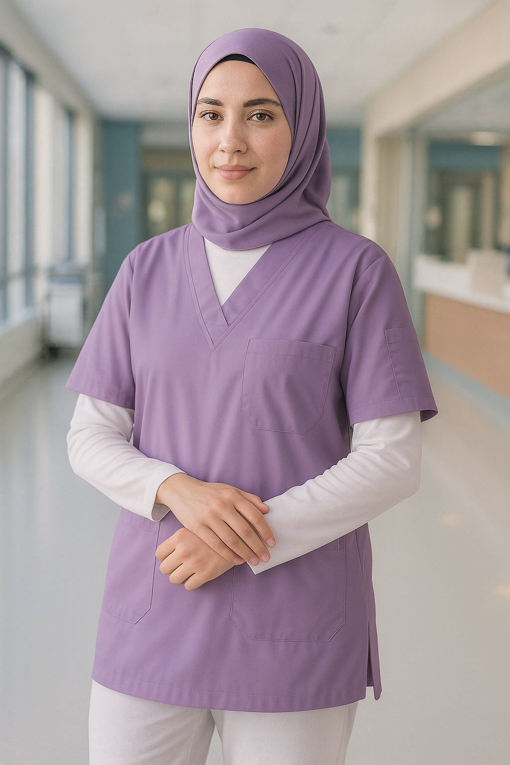 Lila tek üst scrubs forma, sağlık çalışanlarının uzun saatler boyunca ihtiyaç duyduğu konforu ve dayanıklılığı bir arada sunar. %67 PES ve %33 pamuk karışımı özel kumaşı sayesinde terletme ve solma yapmaz, gün boyu nefes alabilen yapısı ile ferahlık sağlar. Unisex kalıpta üretilmiştir; hem kadın hem erkek sağlık çalışanları için uygundur. Kolay ütülenebilir yapısı ile çok buruşma yapmaz, pratik cepleri ile işlevsellik sunar. Klinikler, hastaneler ve laboratuvarlar için profesyonel bir seçimdir.