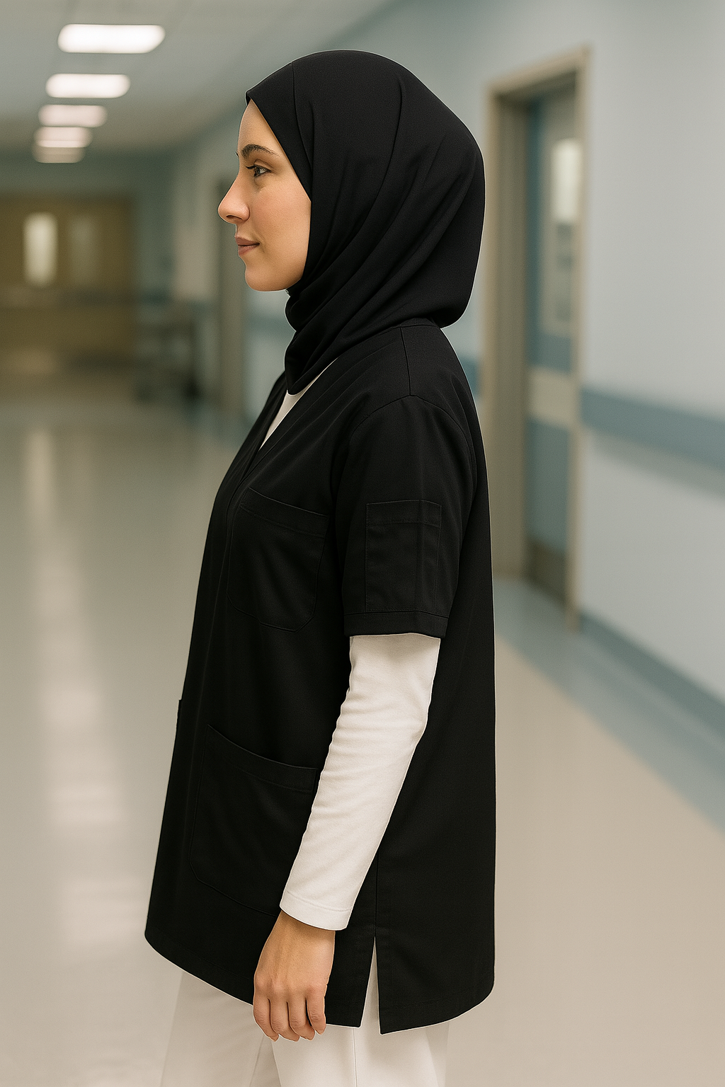 Siyah tek üst scrubs forma, sağlık çalışanlarının uzun saatler boyunca ihtiyaç duyduğu konforu ve dayanıklılığı bir arada sunar. %67 PES ve %33 pamuk karışımı özel kumaşı sayesinde terletme ve solma yapmaz, gün boyu nefes alabilen yapısı ile ferahlık sağlar. Unisex kalıpta üretilmiştir; hem kadın hem erkek sağlık çalışanları için uygundur. Kolay ütülenebilir yapısı ile çok buruşma yapmaz, pratik cepleri ile işlevsellik sunar. Klinikler, hastaneler ve laboratuvarlar için profesyonel bir seçimdir.