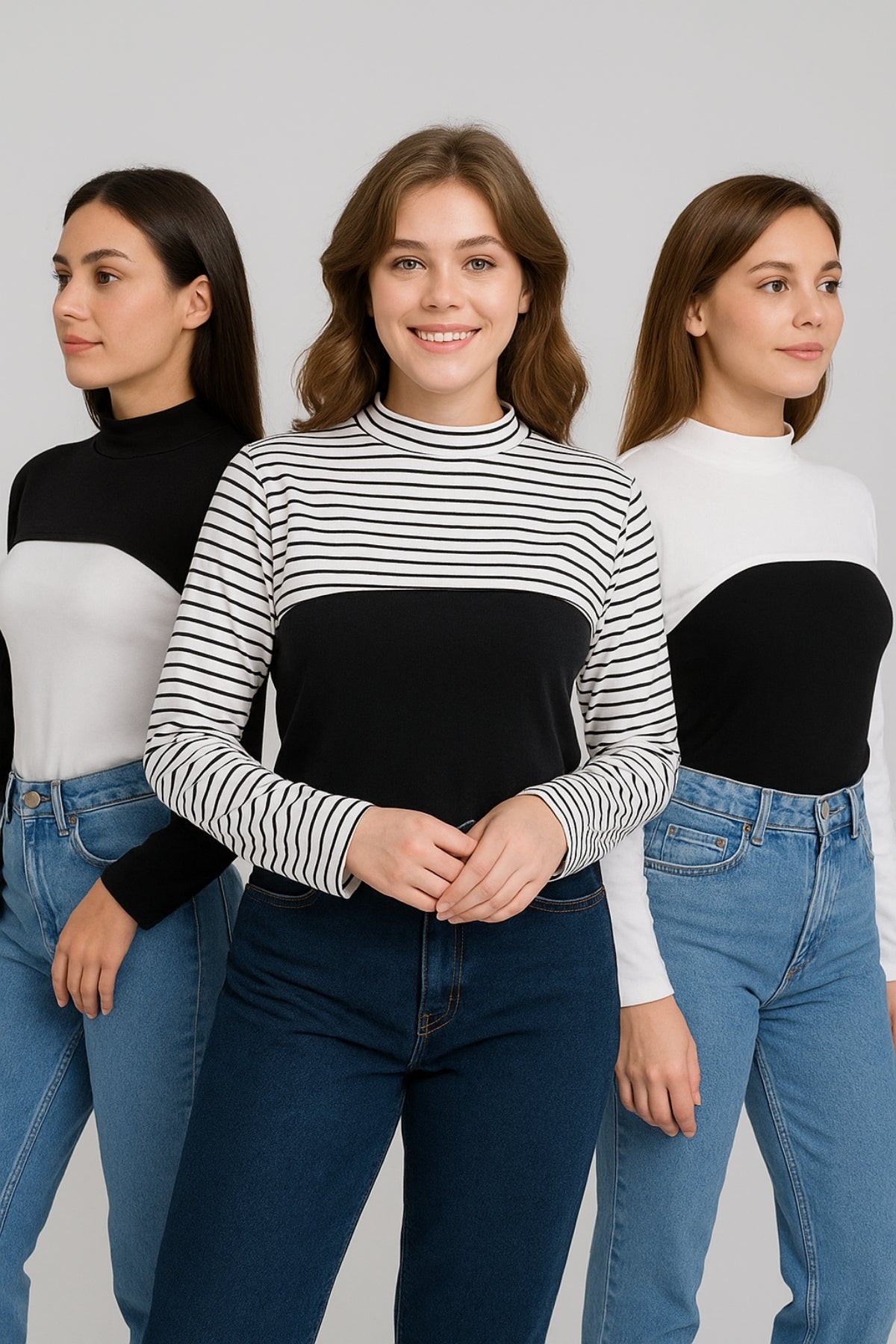 3'lü Set Dik Yaka Boyunluklu Kolluk - Beyaz, Siyah ve Beyaz Çizgili