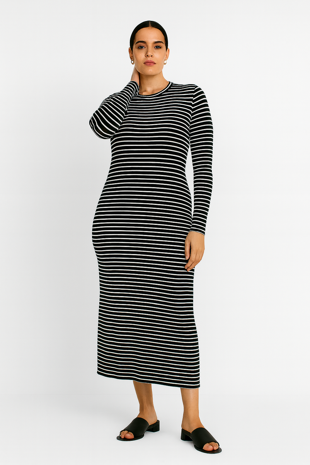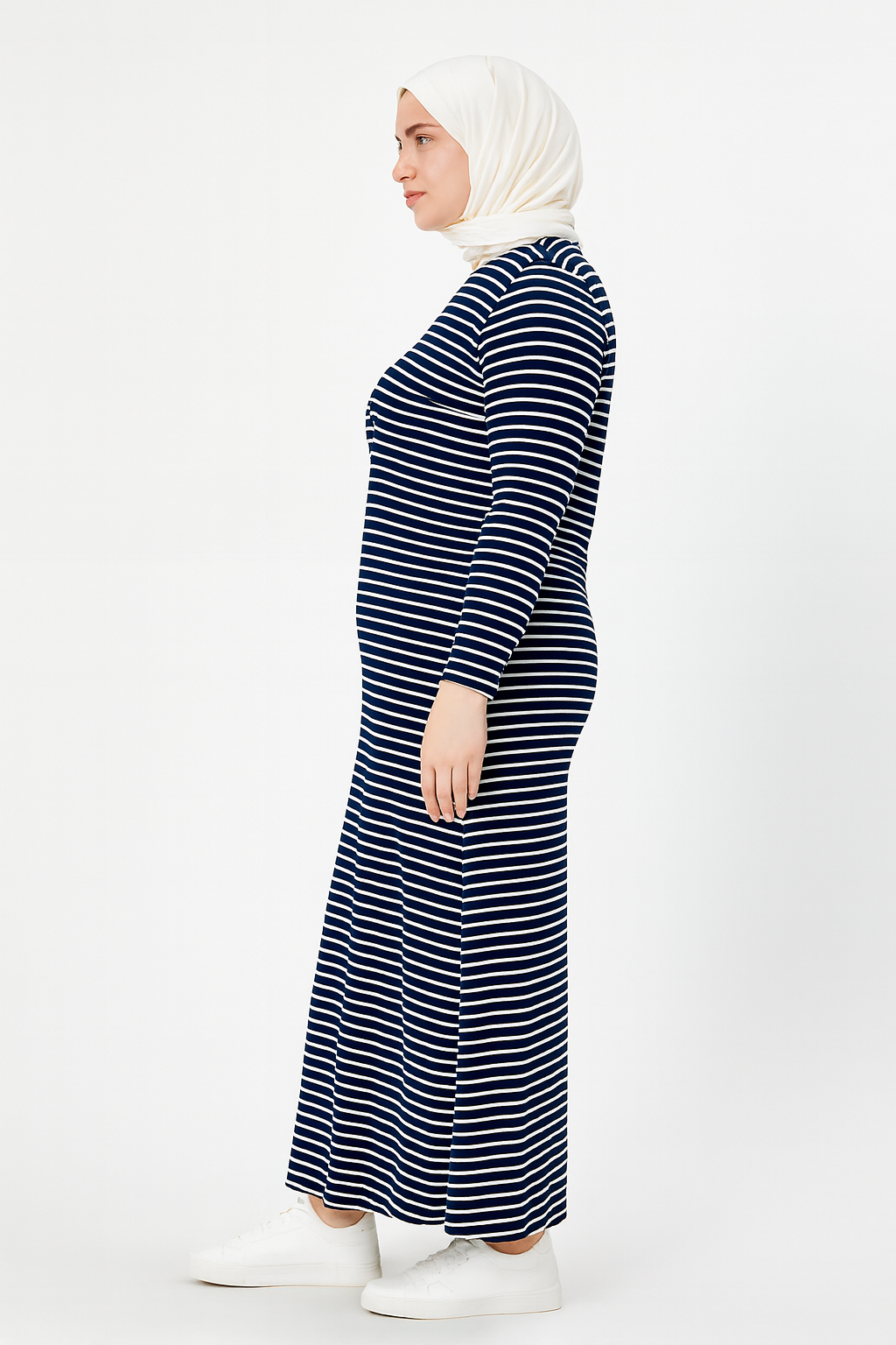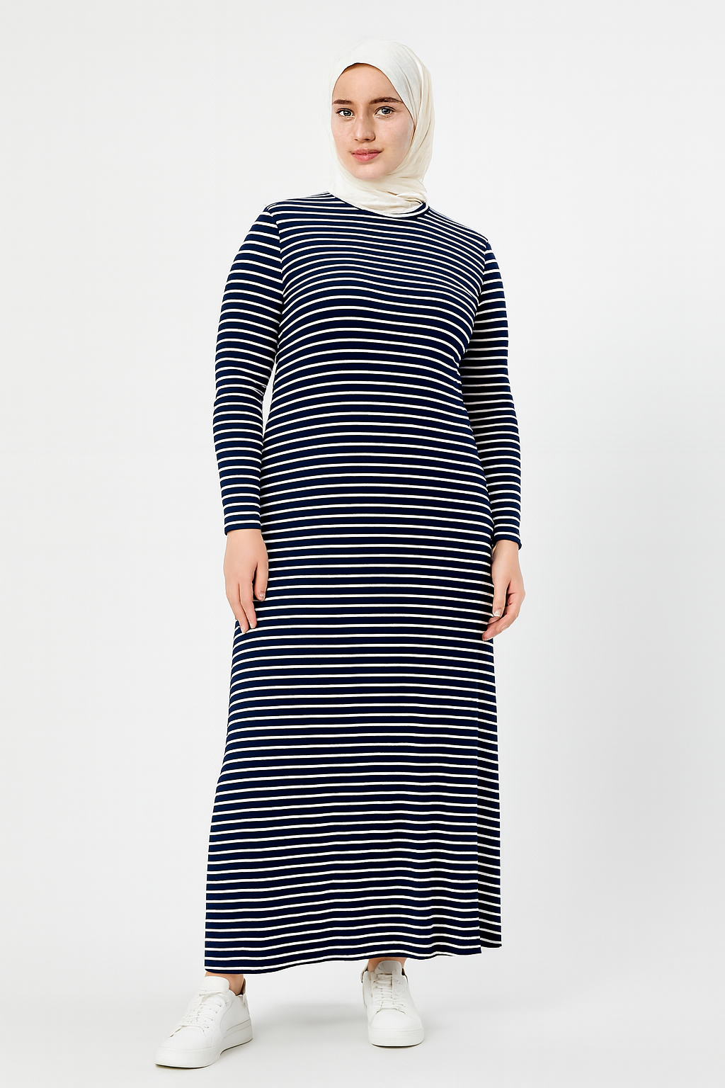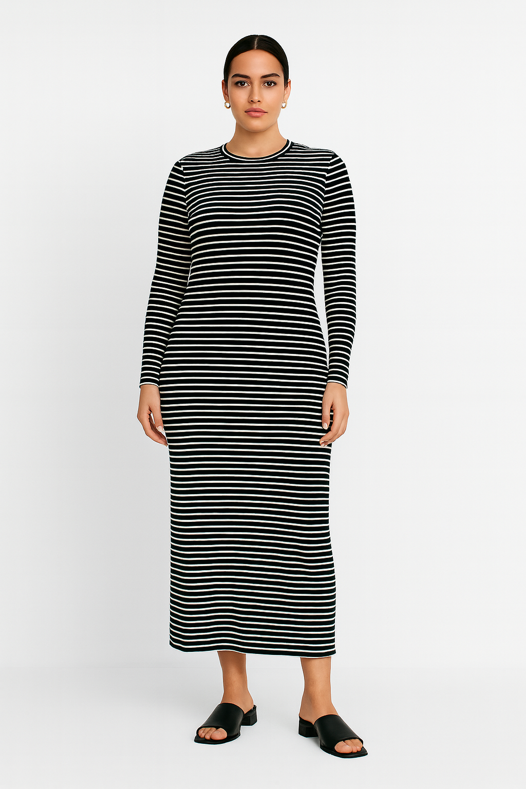 Büyük Beden Uzun Kollu Fitilli Elbise - Siyah Beyaz Çizgili