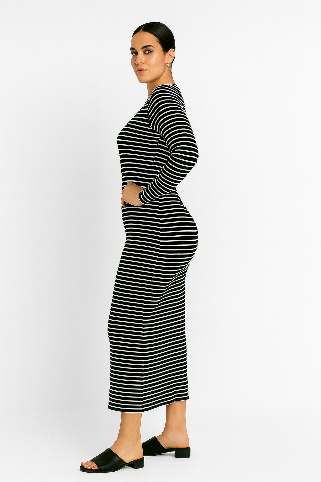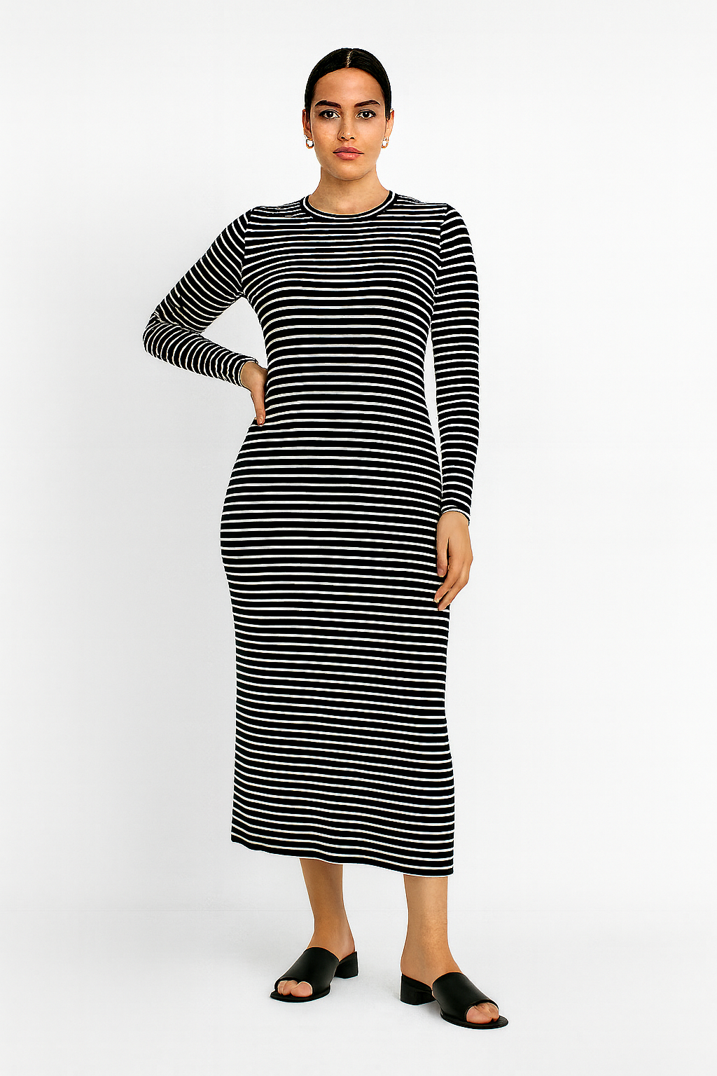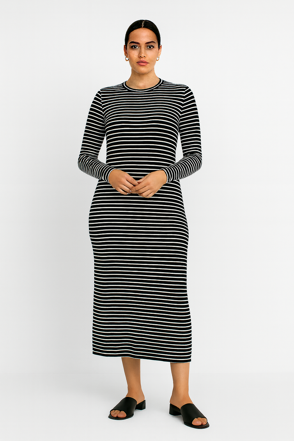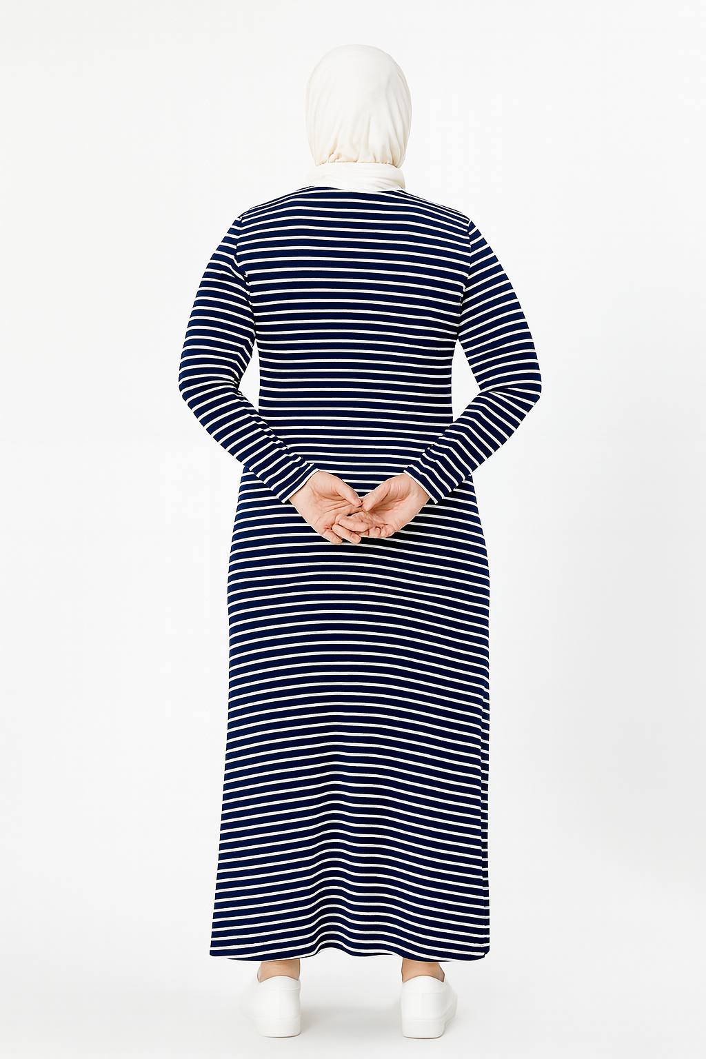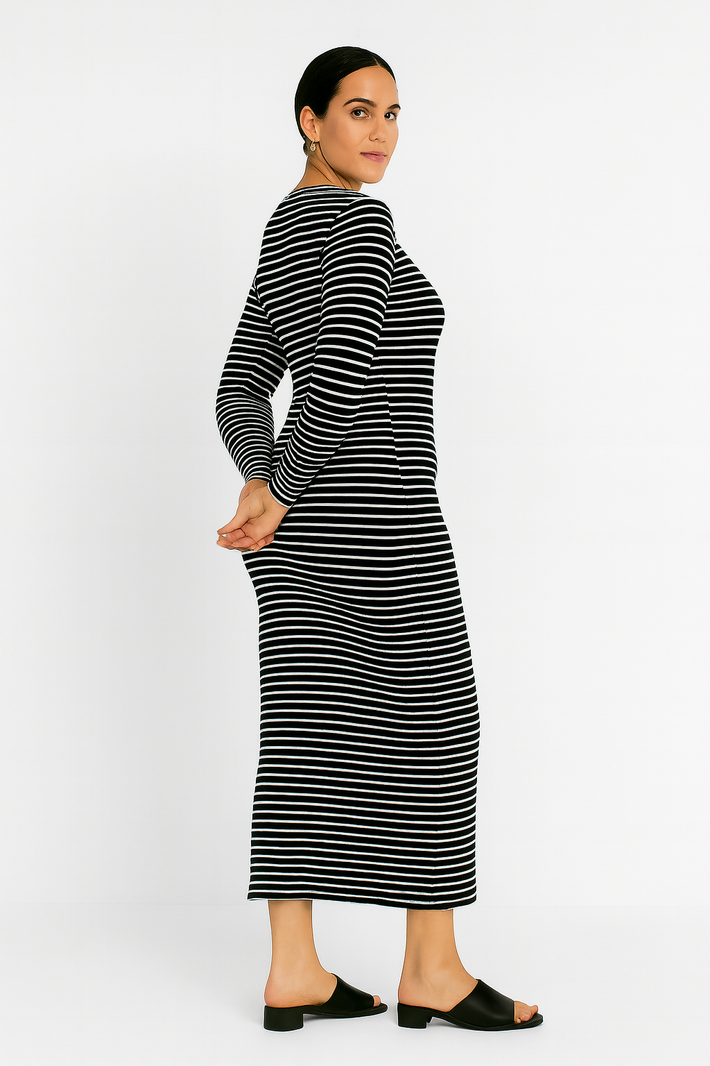 Büyük Beden Uzun Kollu Fitilli Elbise - Siyah Beyaz Çizgili