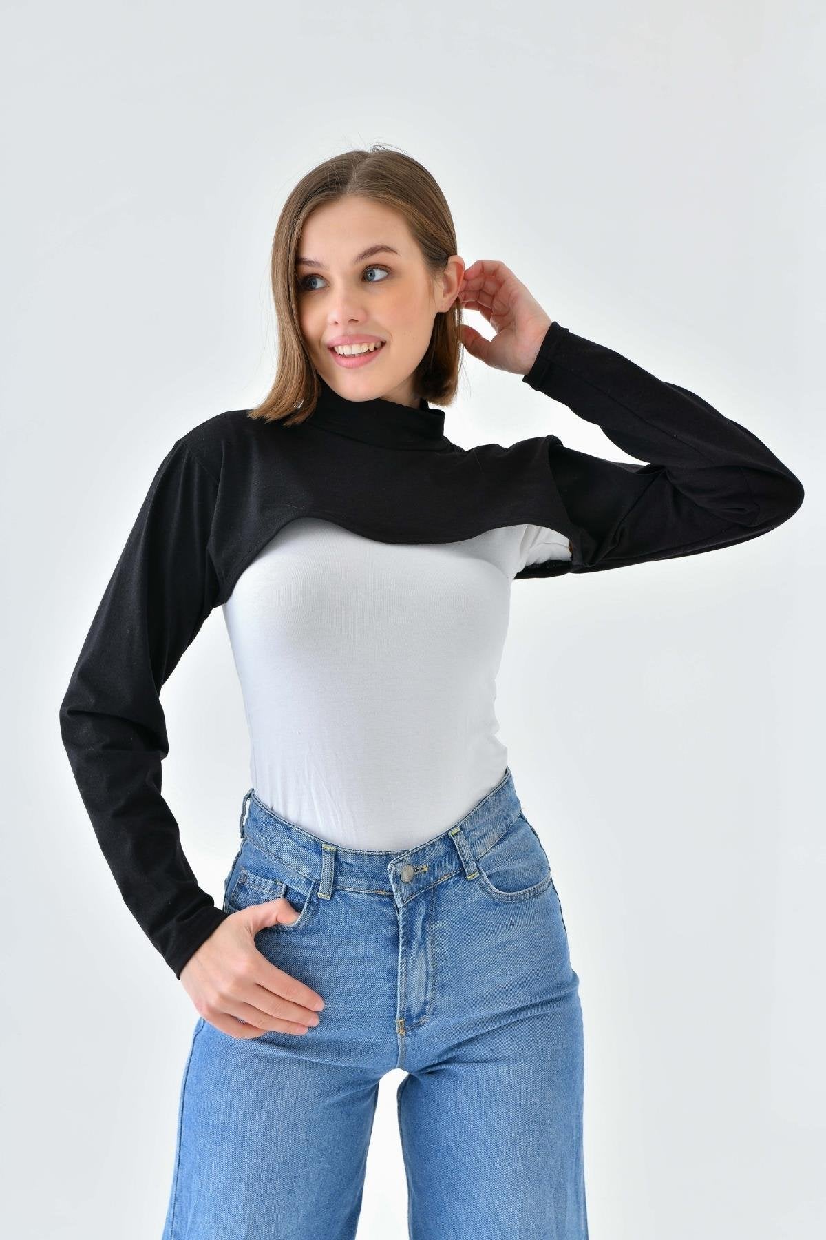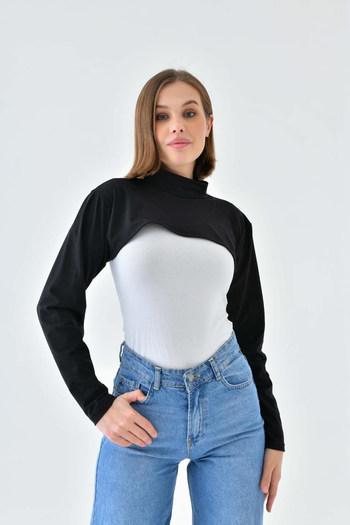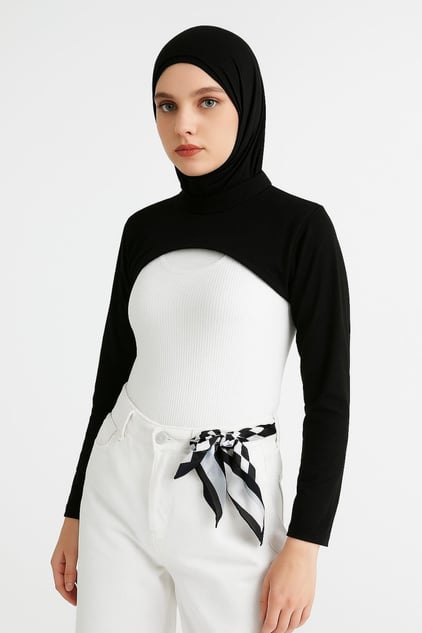 Mirach Textile’in Siyah Dik Yaka Boyunluklu Kolluk modeli, tesettür giyimde hem şıklığı hem de fonksiyonelliği bir araya getirir. %95 pamuk ve %5 likra karışımıyla üretilen bu içlik, cilt dostu yapısı sayesinde gün boyu konfor sağlar. Dik yaka detayı boyun bölgesini tamamen kapatarak zarif bir görünüm sunarken, esnek kumaşı sayesinde 34-48 beden aralığına rahatça uyum sağlar. Dört mevsim kullanım için ideal olan bu ürün, hem günlük hayatta hem özel günlerde kombinlerin tamamlayıcısıdır.
