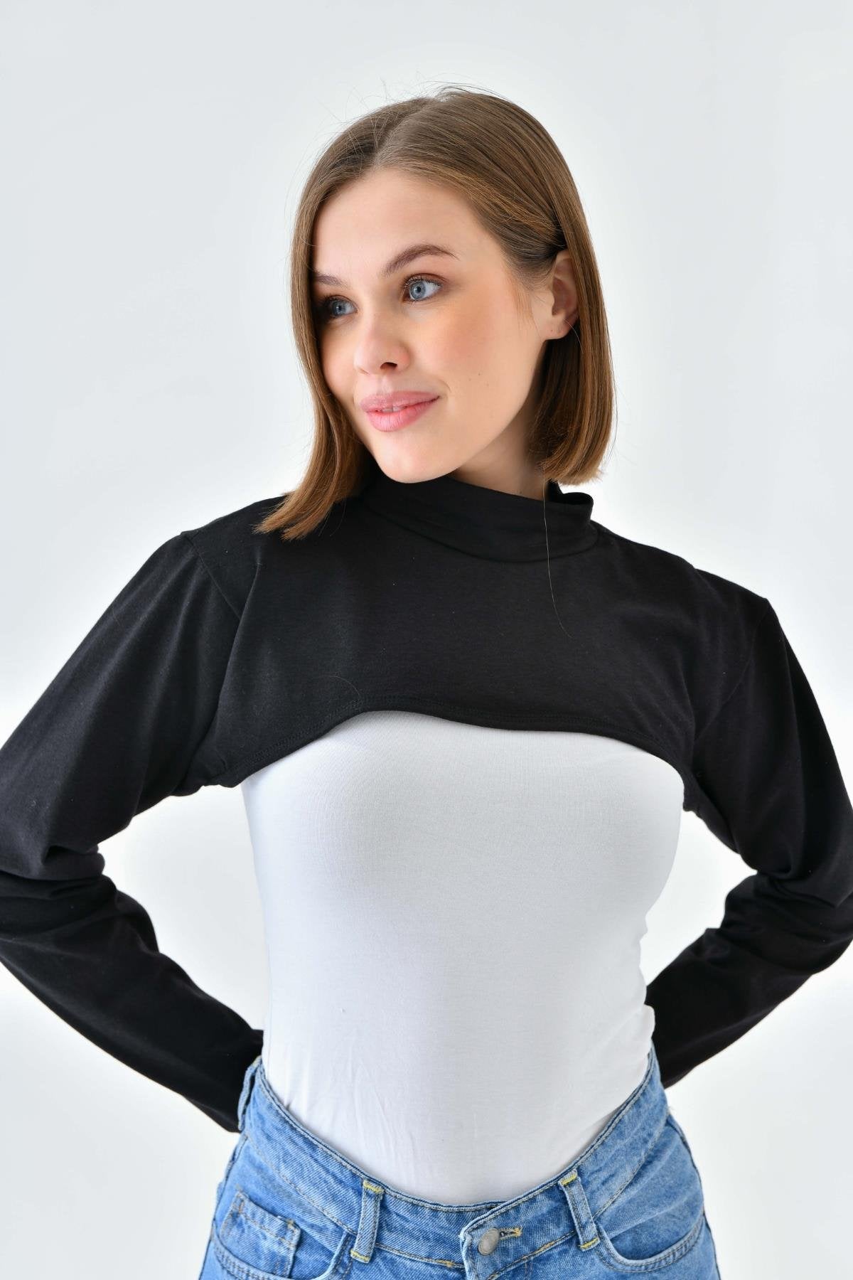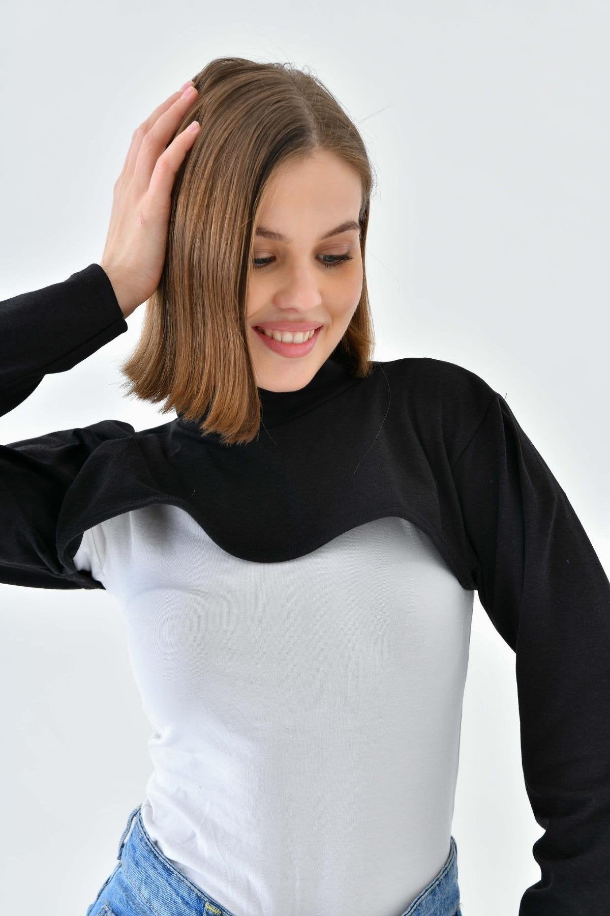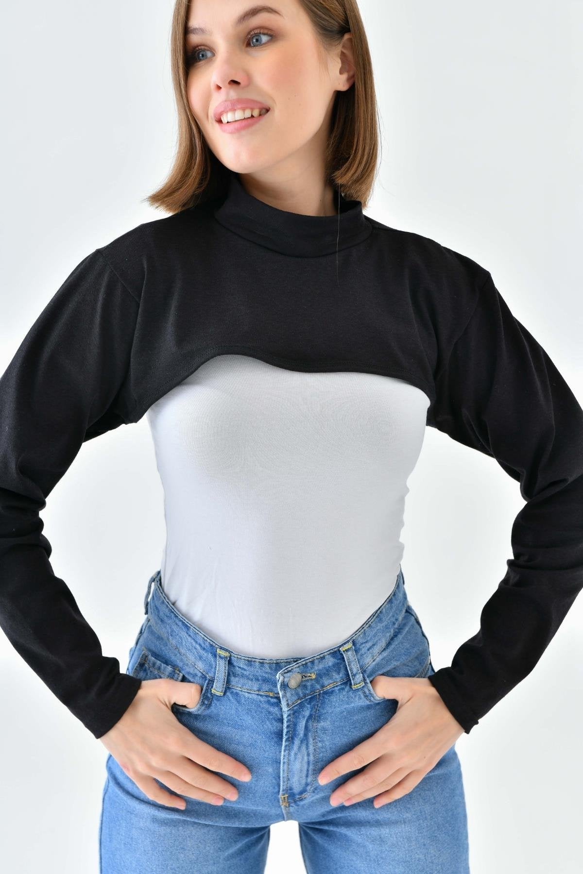 Mirach Textile’in Siyah Dik Yaka Boyunluklu Kolluk modeli, tesettür giyimde hem şıklığı hem de fonksiyonelliği bir araya getirir. %95 pamuk ve %5 likra karışımıyla üretilen bu içlik, cilt dostu yapısı sayesinde gün boyu konfor sağlar. Dik yaka detayı boyun bölgesini tamamen kapatarak zarif bir görünüm sunarken, esnek kumaşı sayesinde 34-48 beden aralığına rahatça uyum sağlar. Dört mevsim kullanım için ideal olan bu ürün, hem günlük hayatta hem özel günlerde kombinlerin tamamlayıcısıdır.