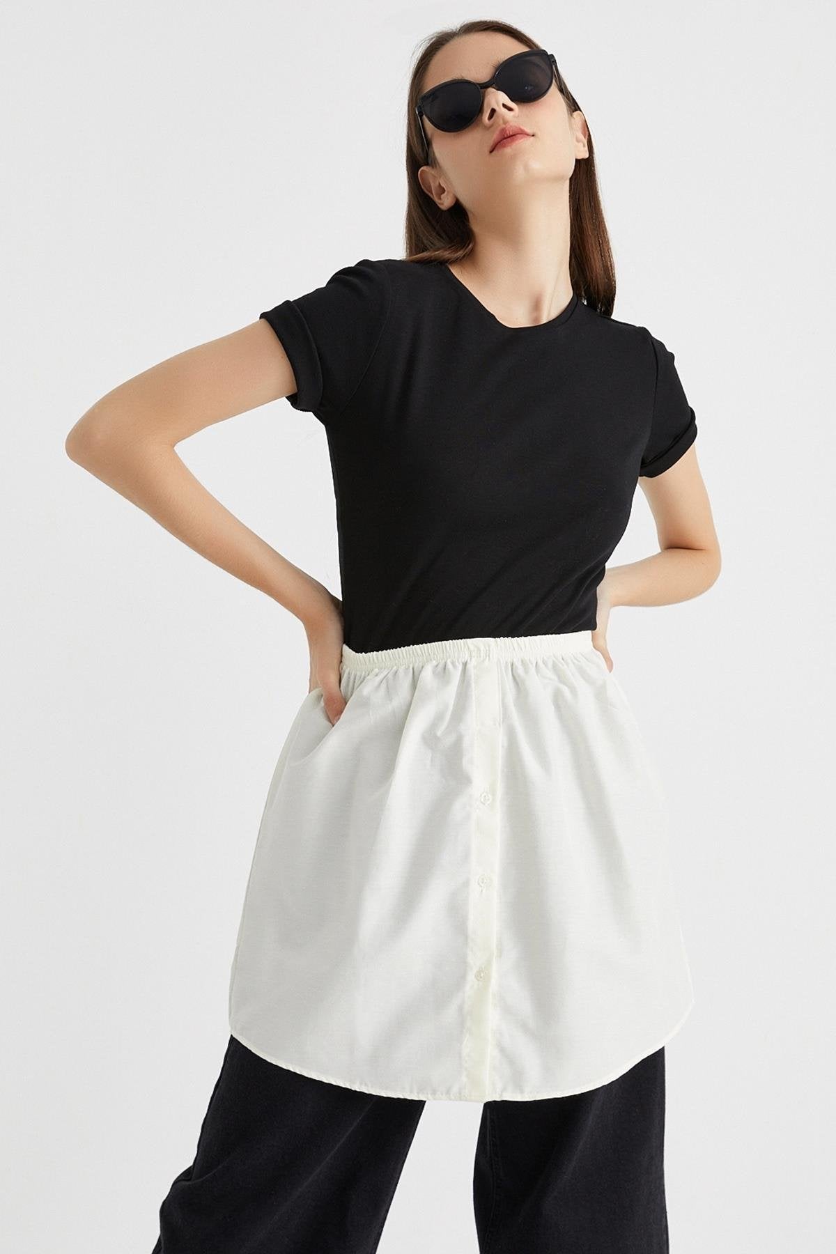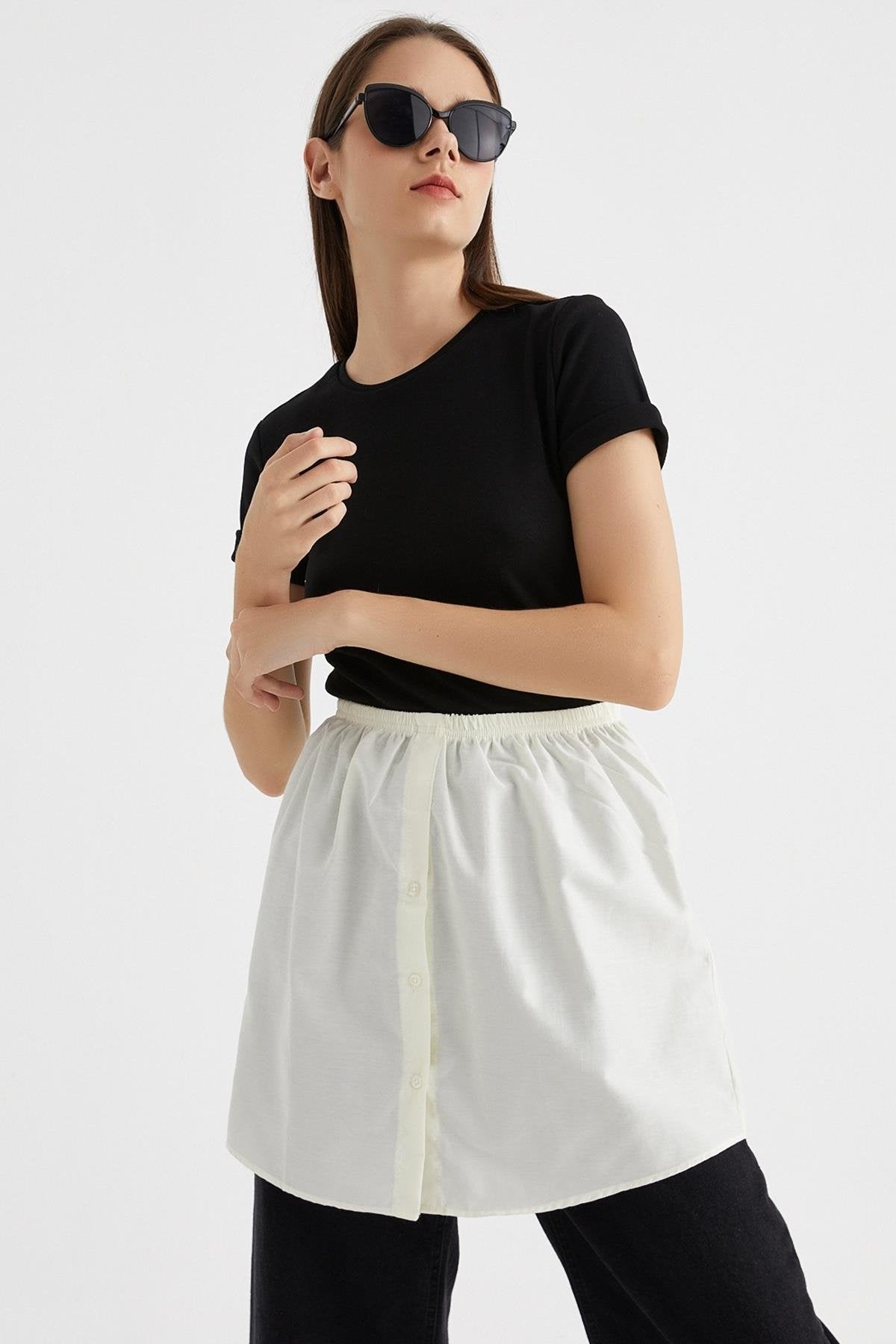 Kaliteli poplin kumaşı hem formunu korur hem de düzenli bir görünüm sunar. Stilini yükselten detaylara önem veriyorsan, bu gömlek eteği mutlaka denemelisin.
