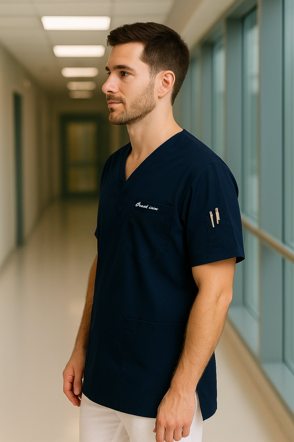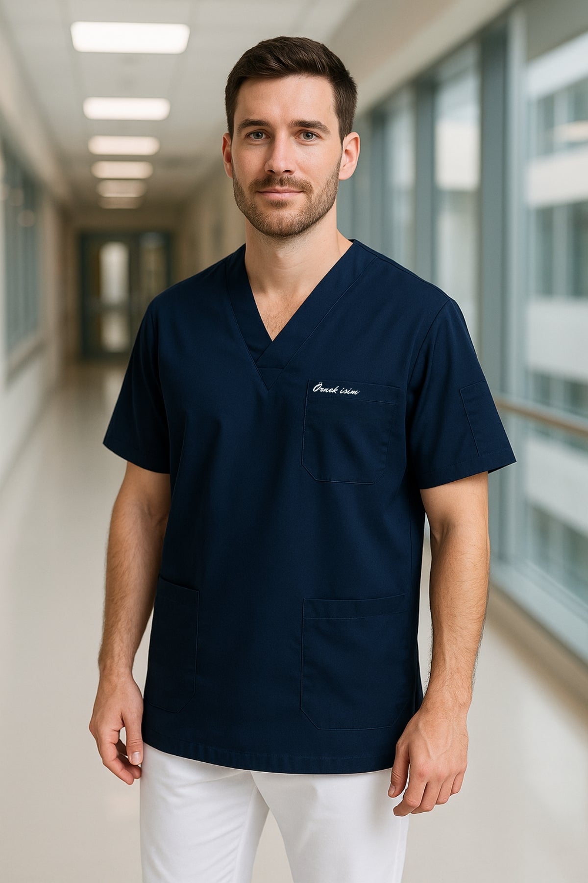Kişiye Özel İsimli Erkek Tek Üst 4 Cepli Scrubs Forma - Lacivert