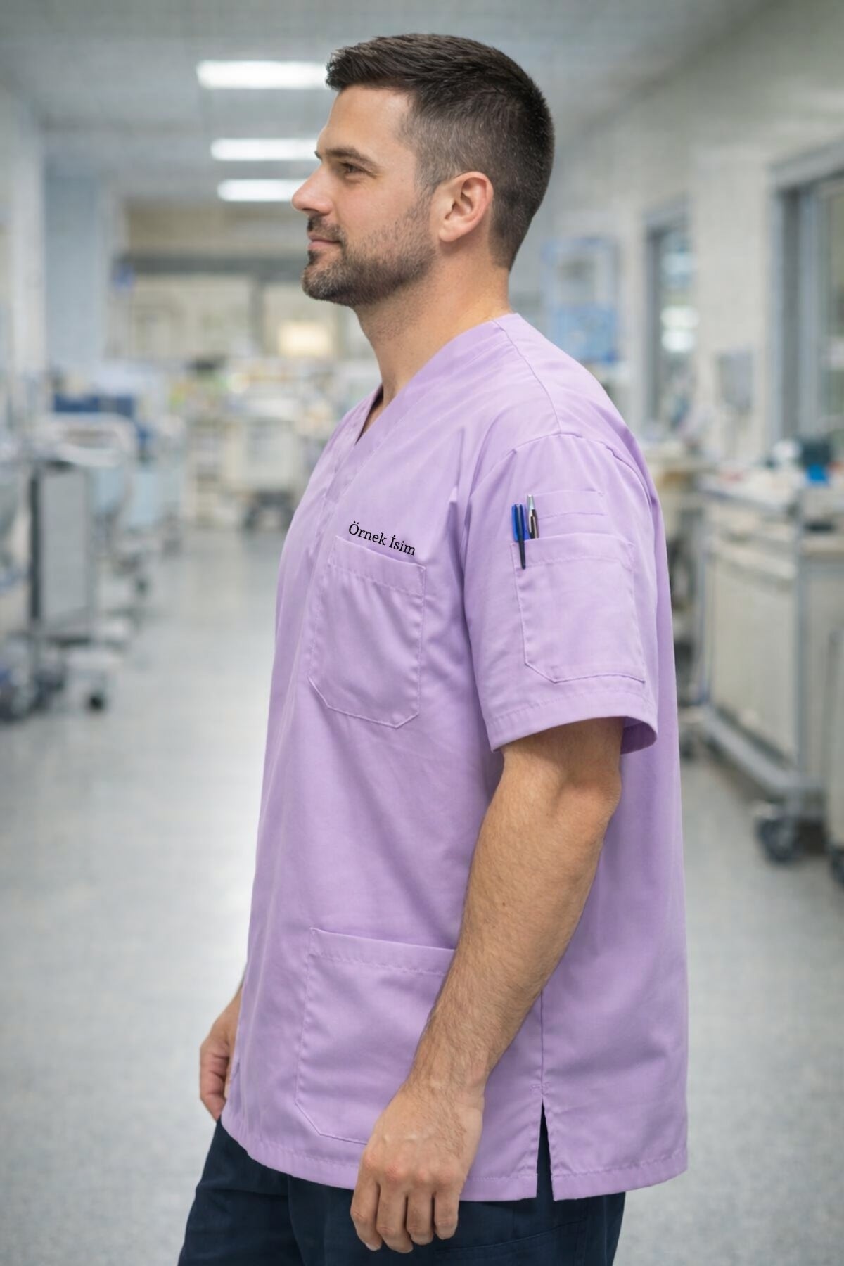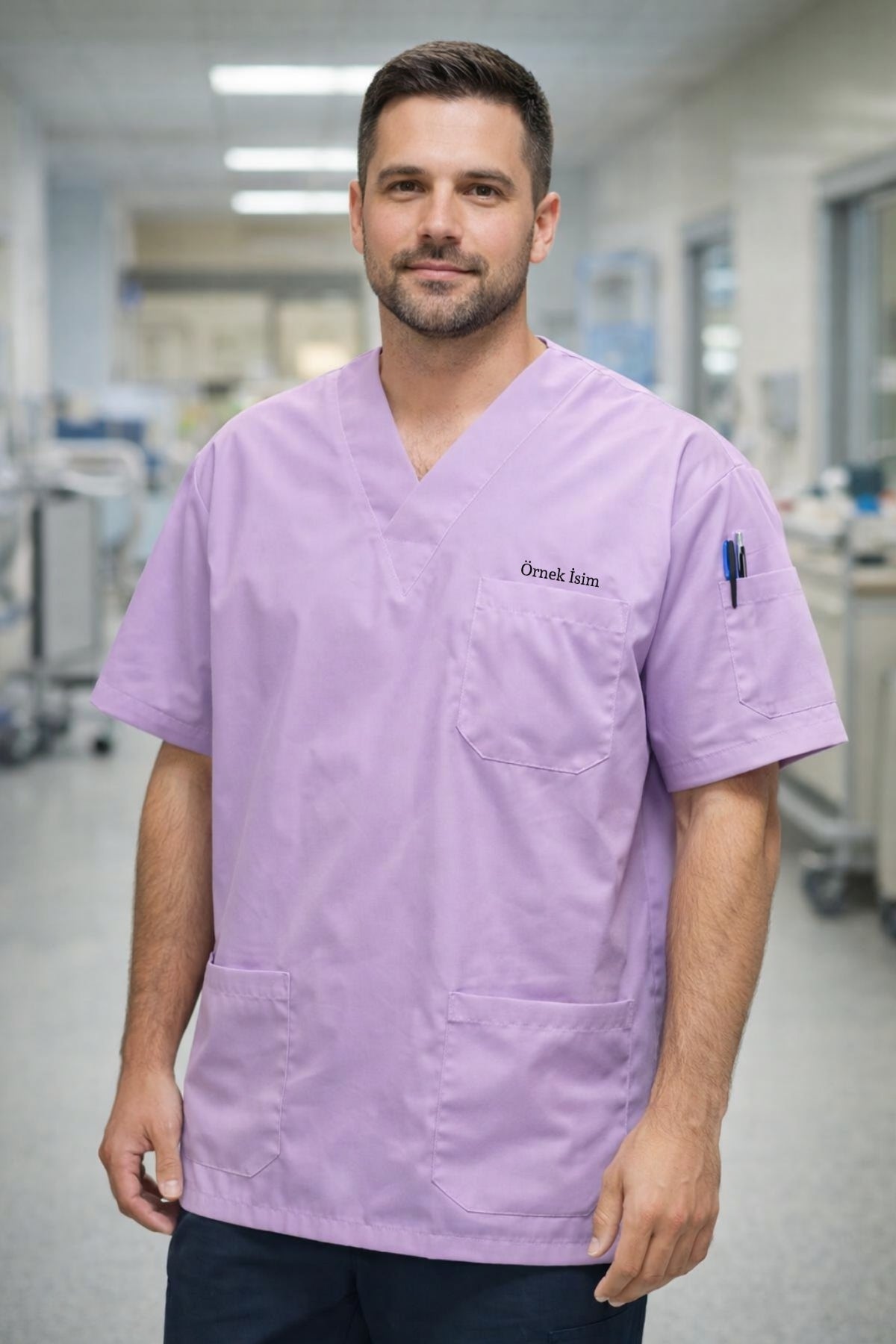 Kişiye Özel İsimli Erkek Tek Üst 4 Cepli Scrubs Forma - Lila