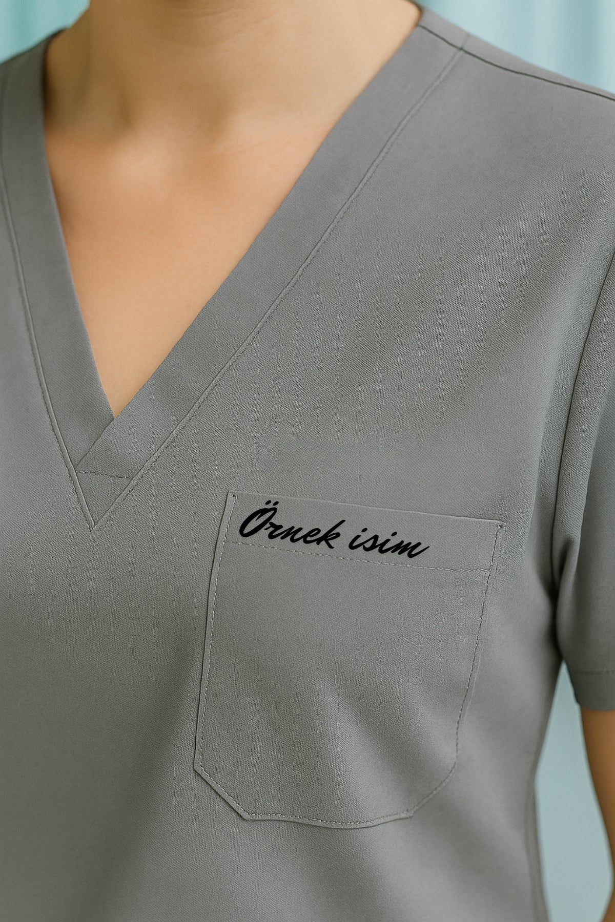 Kişiye Özel İsimli Tek Üst 4 Cepli Scrubs Forma - Gri
