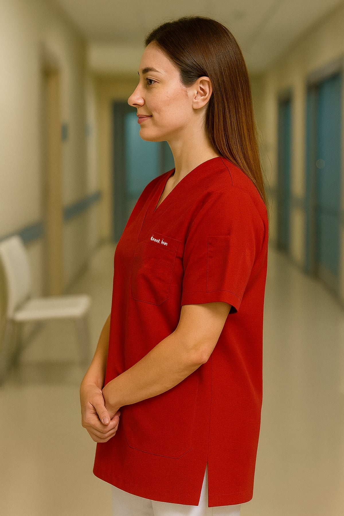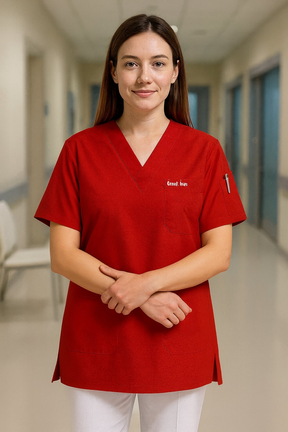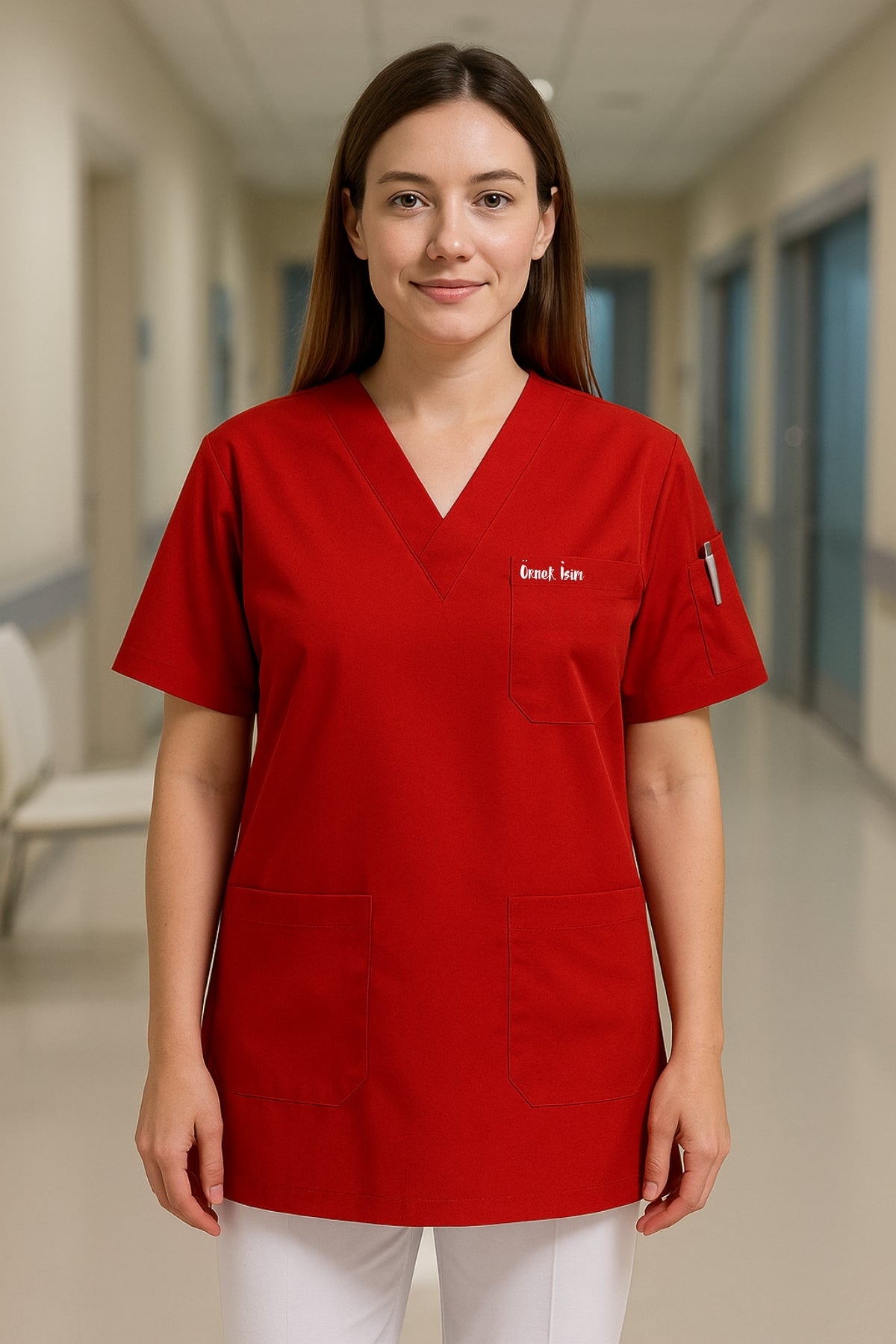 Kişiye Özel İsimli Tek Üst 4 Cepli Scrubs Forma - Kırmızı