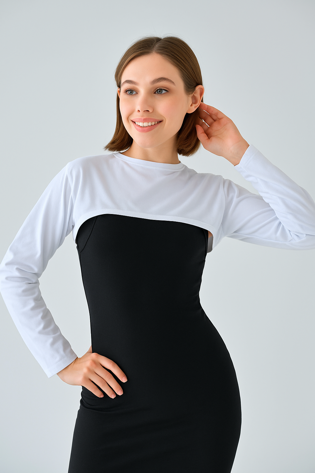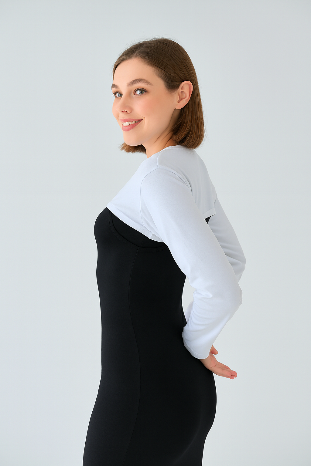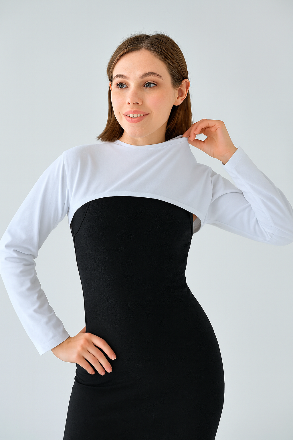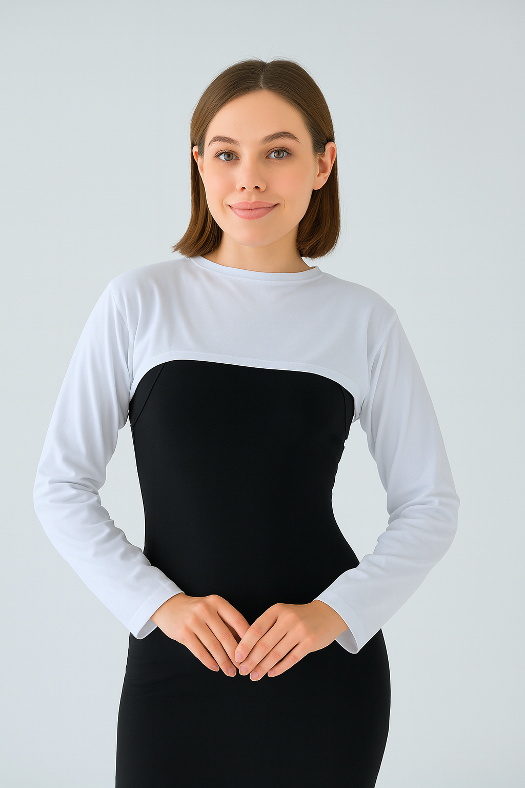 Sıfır yaka tasarımı, kıyafetlerin altında pürüzsüz bir görünüm oluşturur; özellikle dekolte kapatma veya kol boyu kısa üstleri tamamlamak için idealdir.