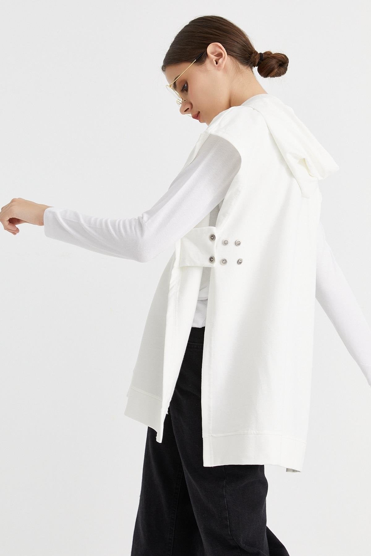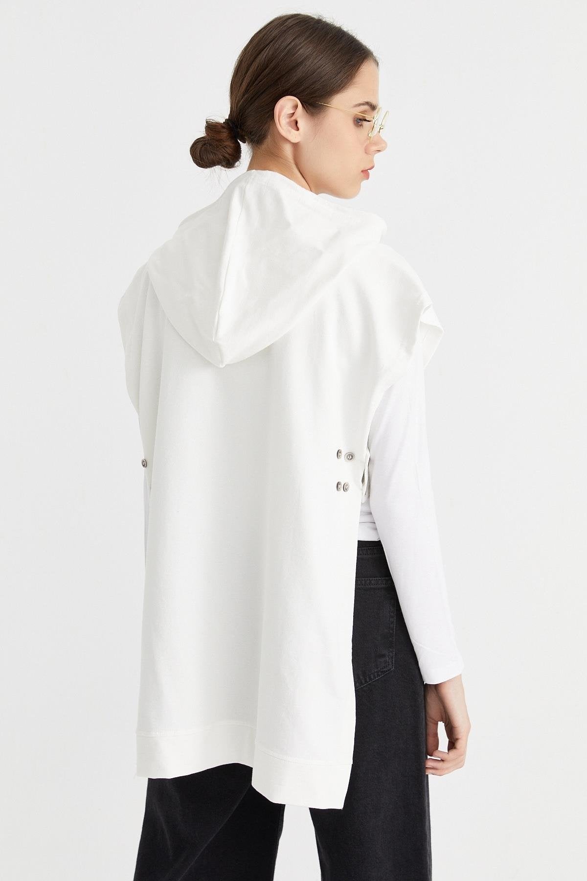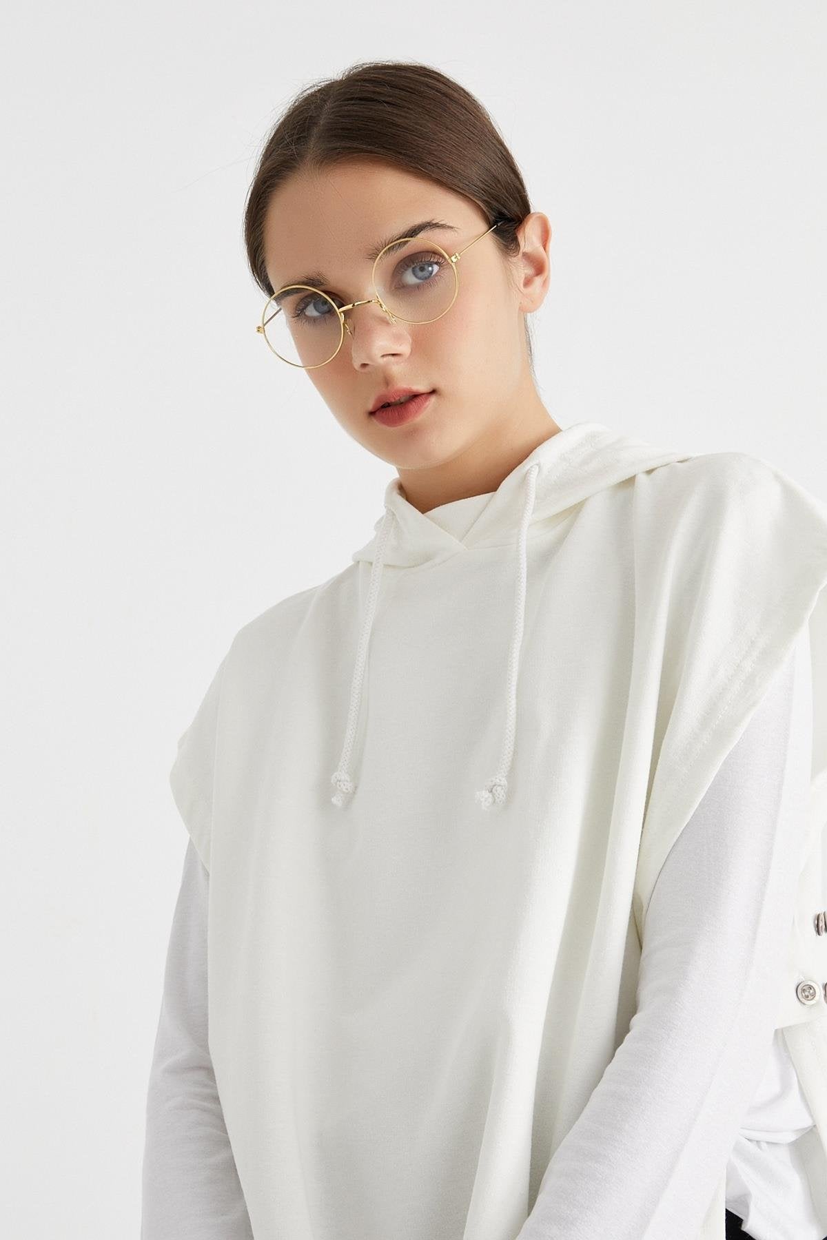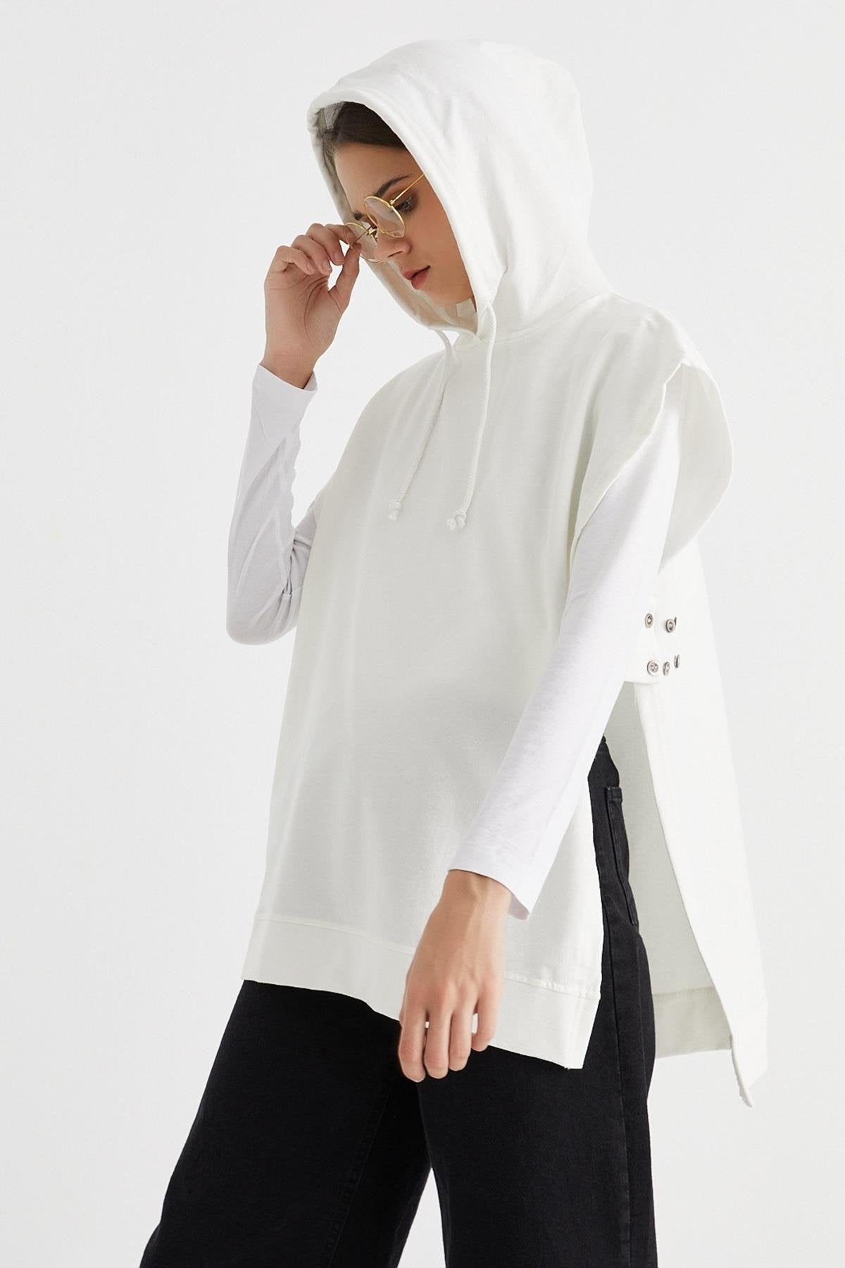 Kapüşonlu ekru süveter sweat, sade tasarımı ve fonksiyonel detaylarıyla hem rahatlık hem de stil sunar. Düz kesimi ve ayarlanabilir düğmeli yapısıyla vücuda uyum sağlar. Yumuşak dokulu çift iplik kumaştan üretilen bu model, dört mevsim kombinlerinize konfor katar. Spor şıklığı seven kadınlar için ideal bir parçadır.