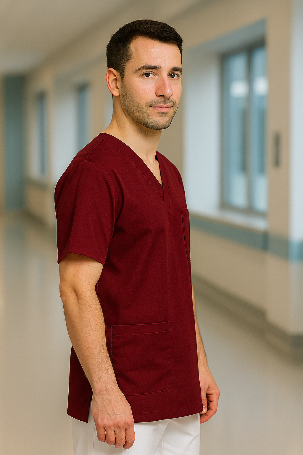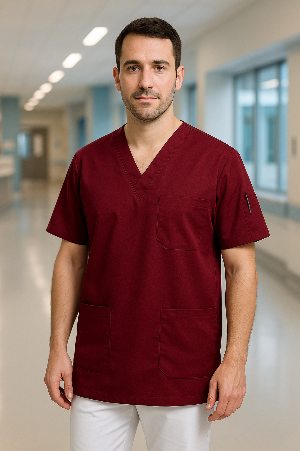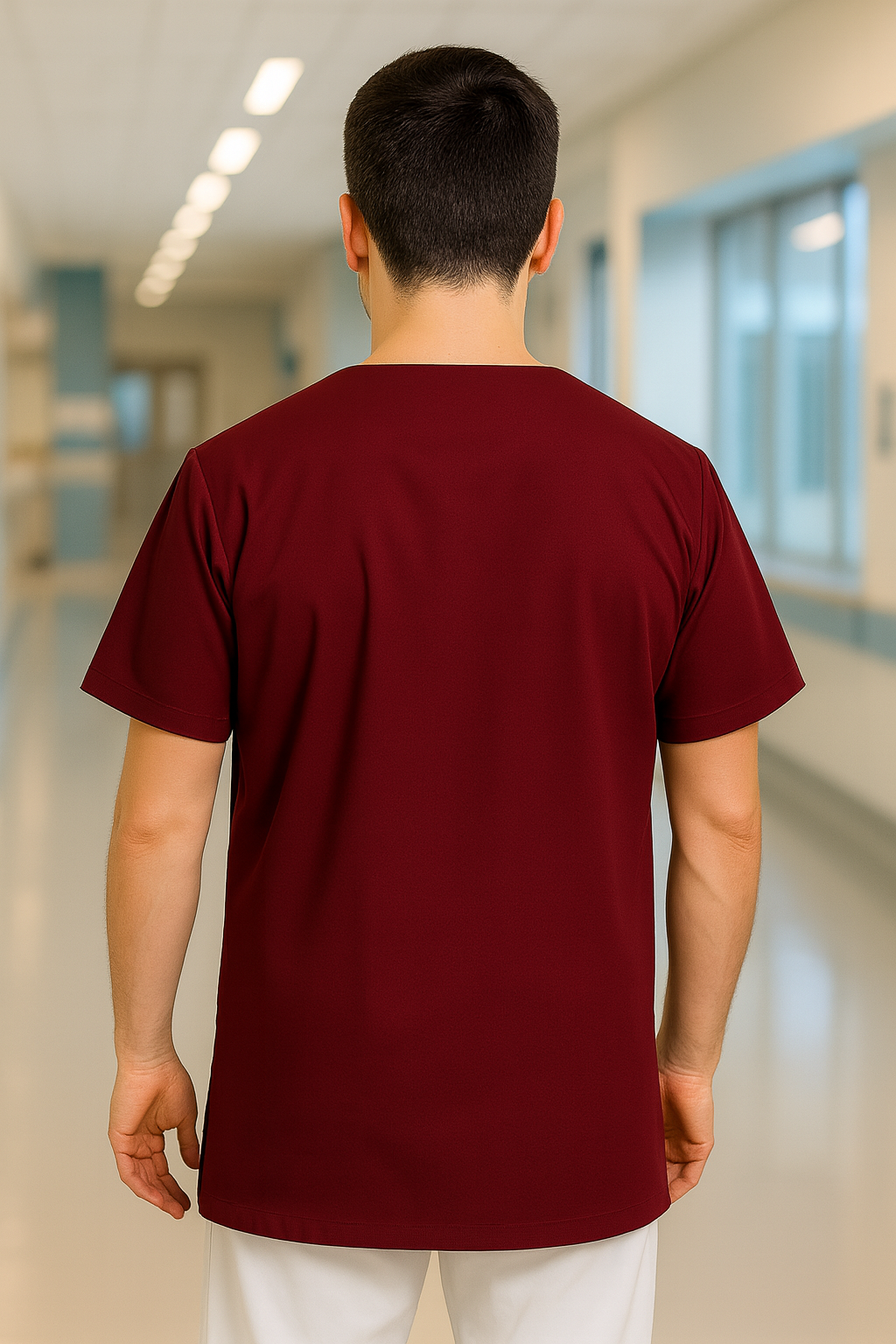 Bordo tek üst scrubs forma, sağlık çalışanlarının uzun saatler boyunca ihtiyaç duyduğu konforu ve dayanıklılığı bir arada sunar. %67 PES ve %33 pamuk karışımı özel kumaşı sayesinde terletme ve solma yapmaz, gün boyu nefes alabilen yapısı ile ferahlık sağlar. Unisex kalıpta üretilmiştir; hem kadın hem erkek sağlık çalışanları için uygundur. Kolay ütülenebilir yapısı ile çok buruşma yapmaz, pratik cepleri ile işlevsellik sunar. Klinikler, hastaneler ve laboratuvarlar için profesyonel bir seçimdir.