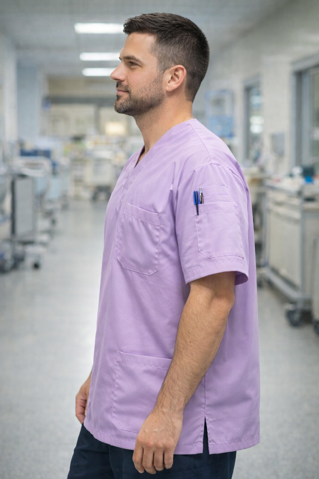 Lila erkek scrubs forma; yoğun çalışma günlerinde konfor, fonksiyonellik ve profesyonel duruş sunmak üzere tasarlanmıştır.