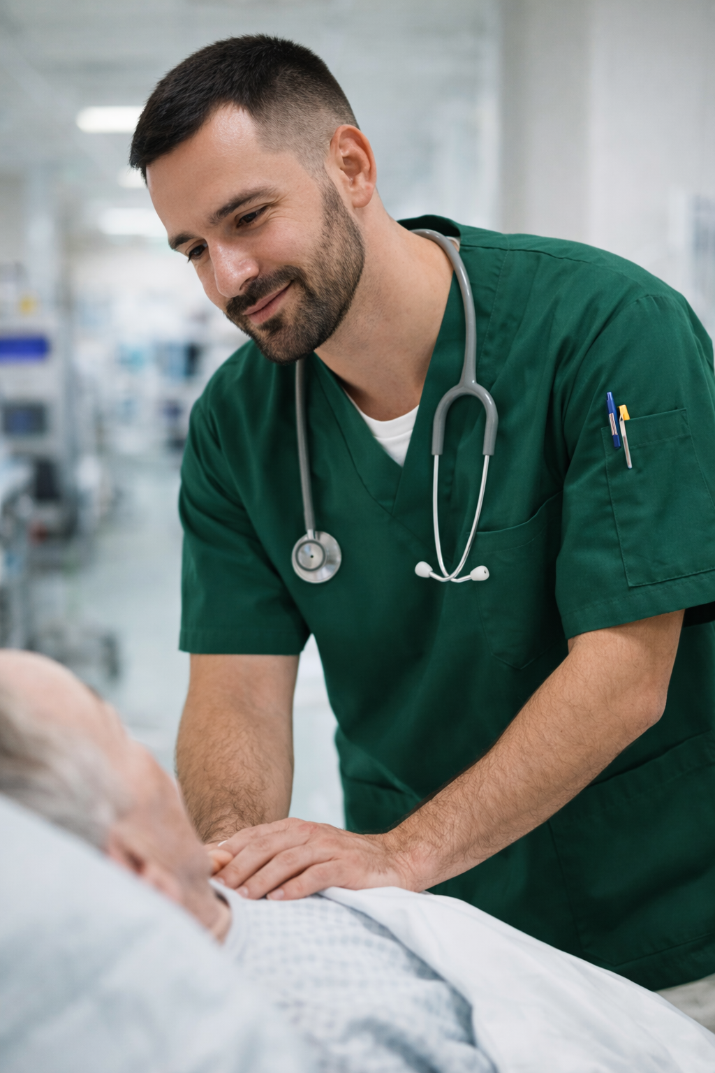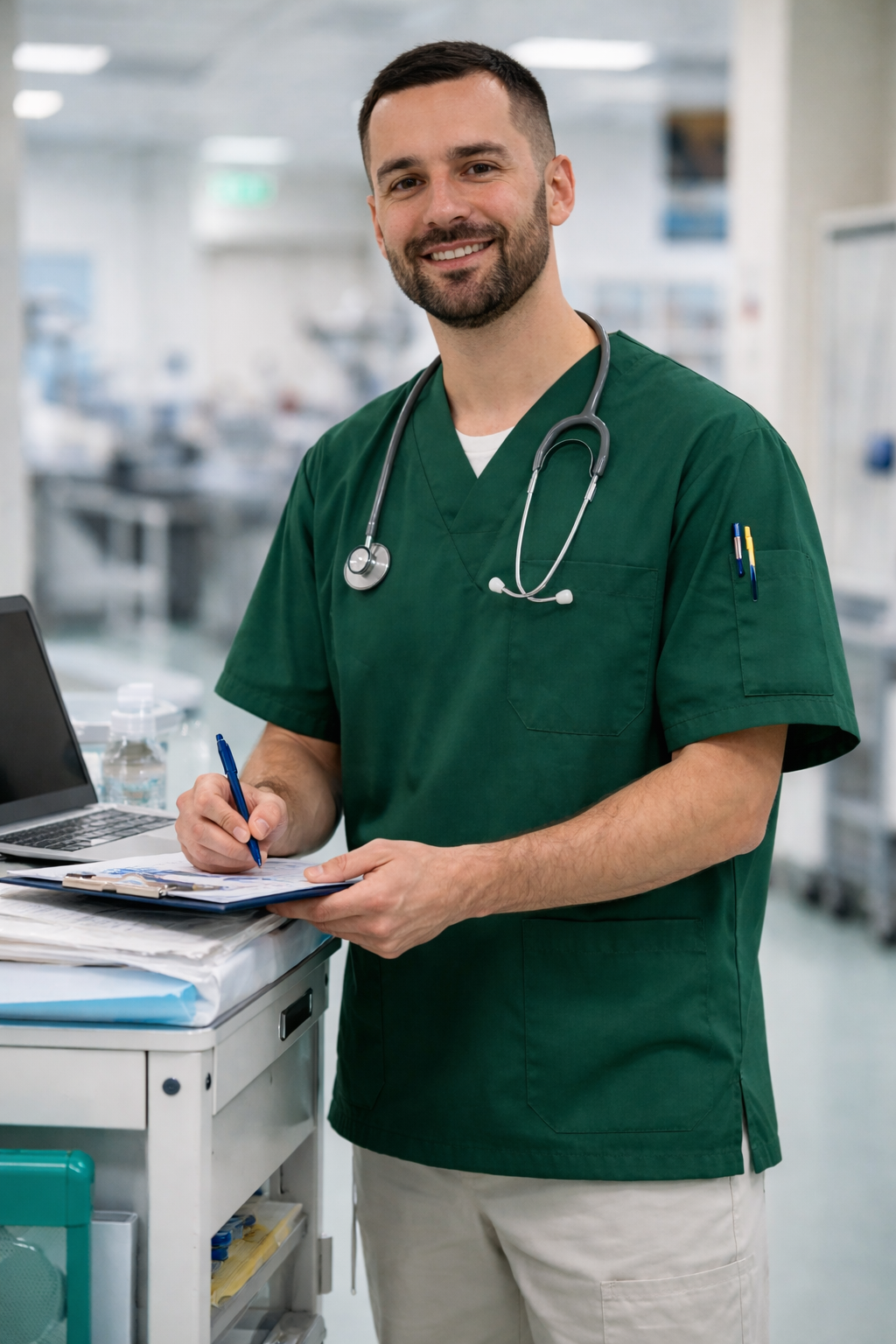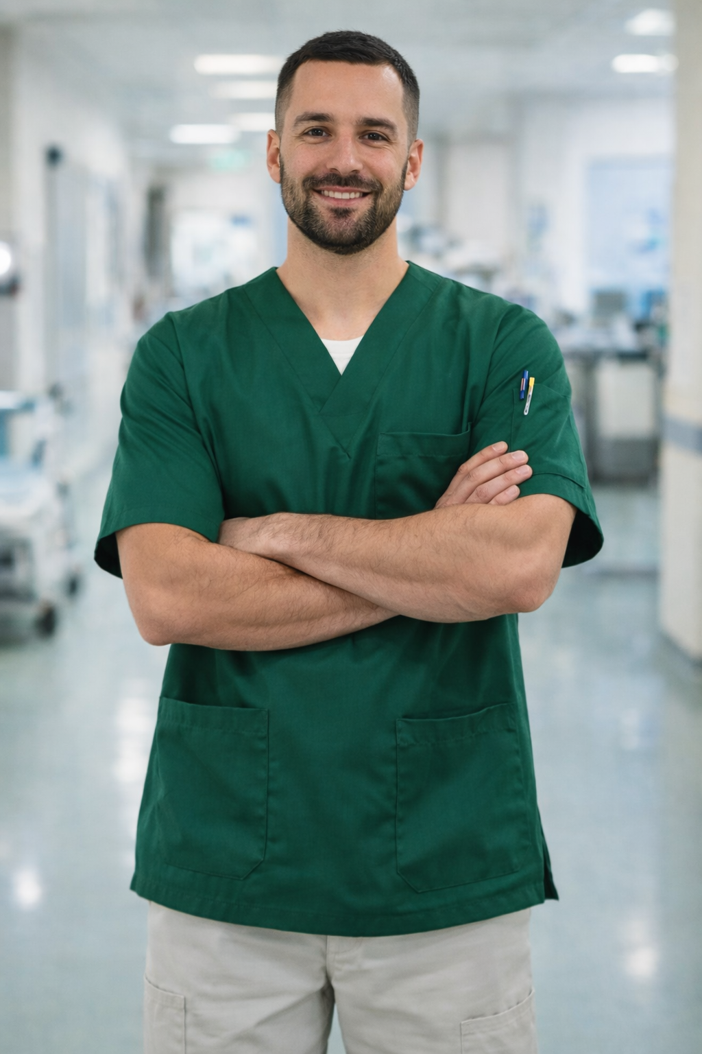 Yeşil erkek scrubs forma; yoğun ve tempolu çalışma günlerinde konfor, dayanıklılık ve profesyonel duruş sunmak üzere tasarlanmıştır.