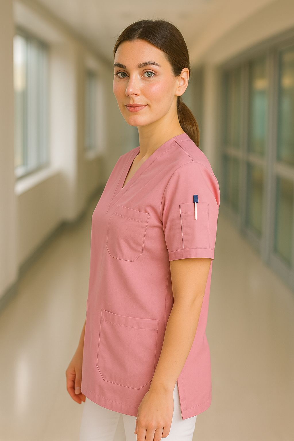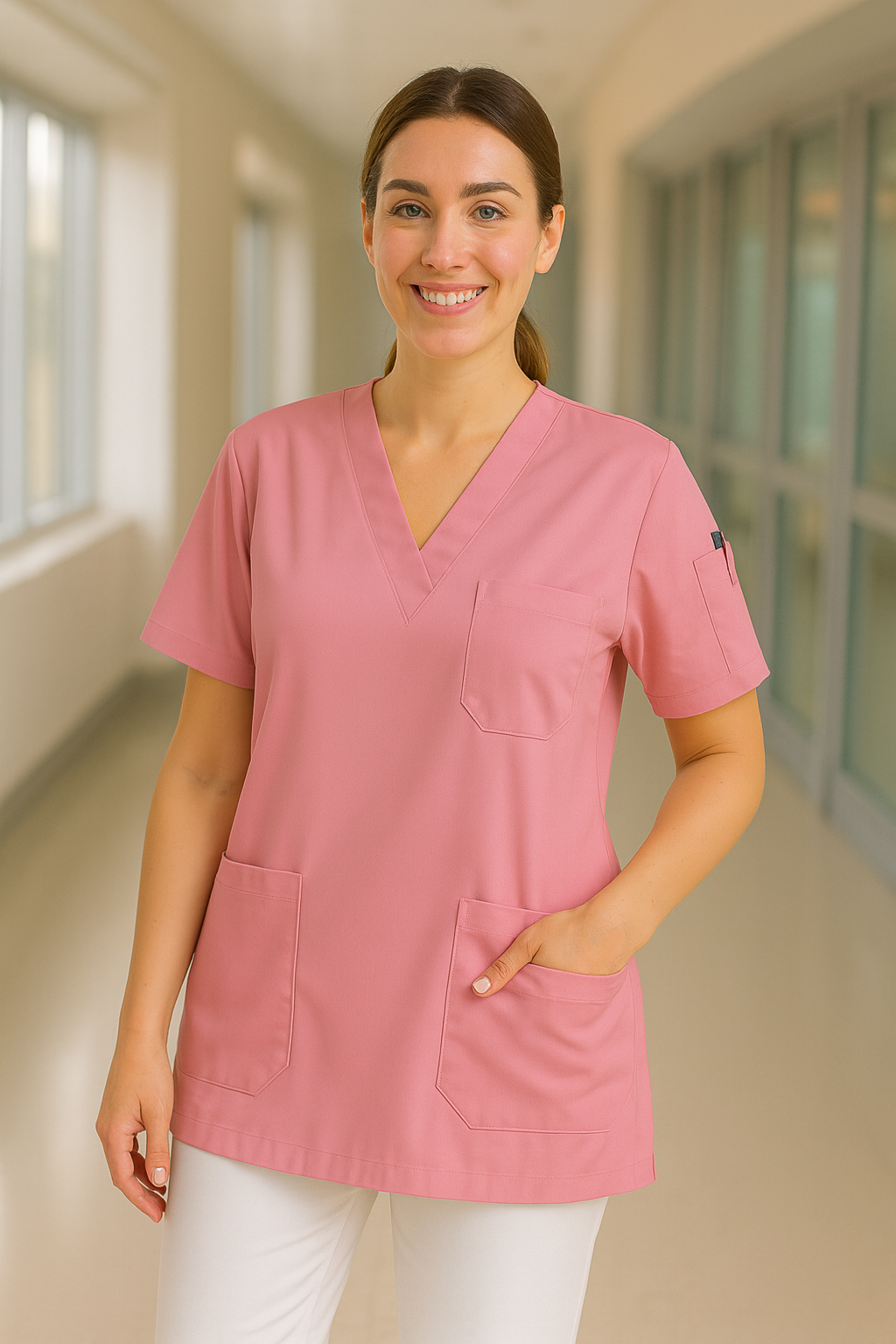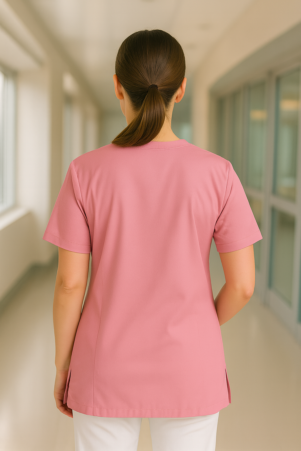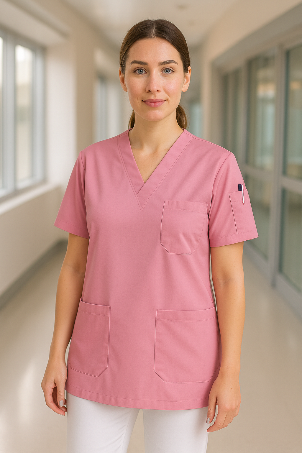 Pembe tek üst scrubs forma, sağlık çalışanlarının uzun saatler boyunca ihtiyaç duyduğu konforu ve dayanıklılığı bir arada sunar. %67 PES ve %33 pamuk karışımı özel kumaşı sayesinde terletme ve solma yapmaz, gün boyu nefes alabilen yapısı ile ferahlık sağlar. Unisex kalıpta üretilmiştir; hem kadın hem erkek sağlık çalışanları için uygundur. Kolay ütülenebilir yapısı ile çok buruşma yapmaz, pratik cepleri ile işlevsellik sunar. Klinikler, hastaneler ve laboratuvarlar için profesyonel bir seçimdir.