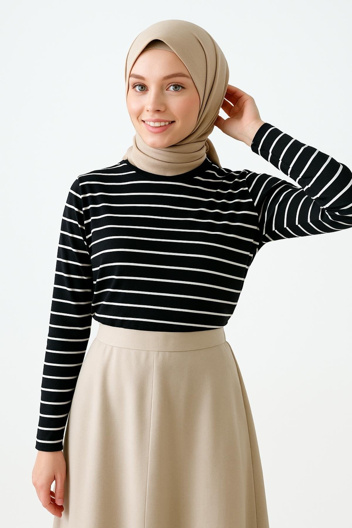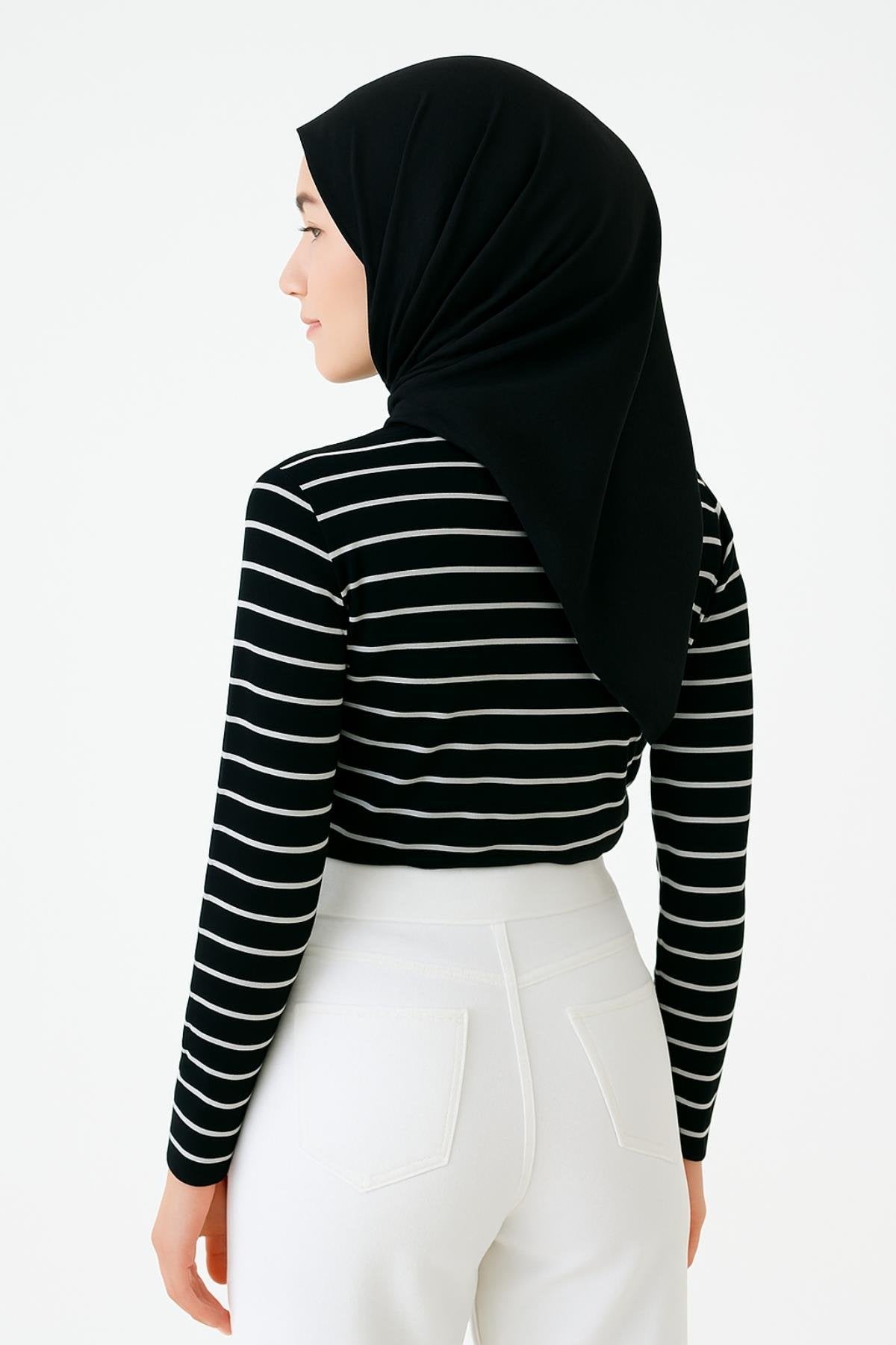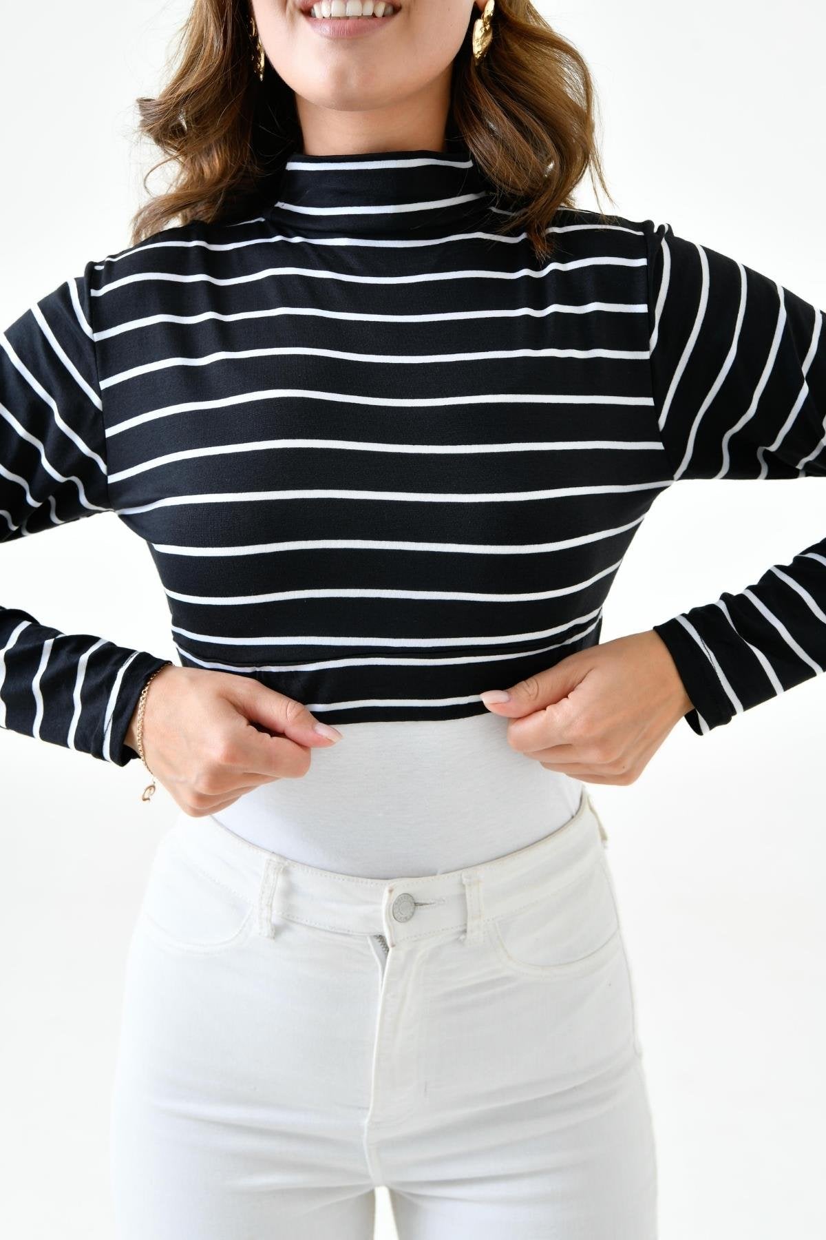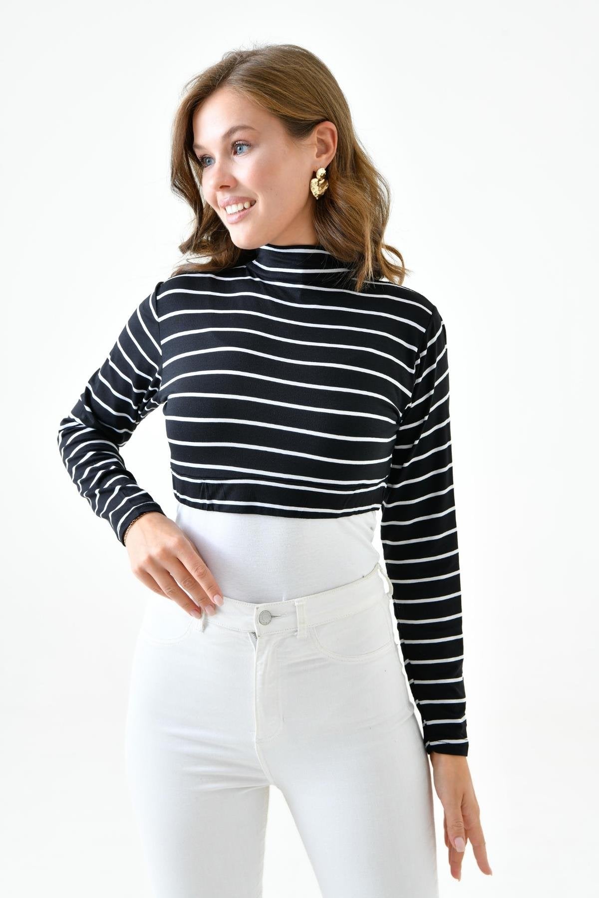 Uzun Kollu Crop Boyunluk - Çizgili (Siyah)