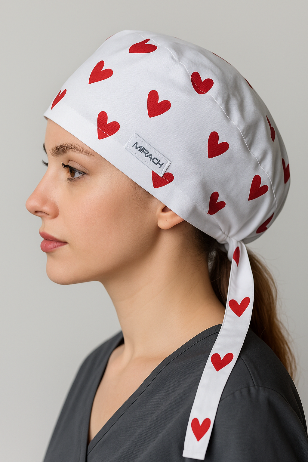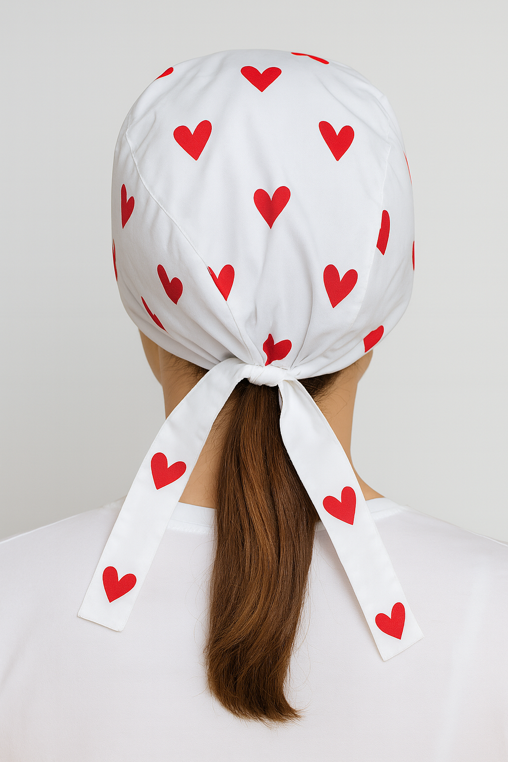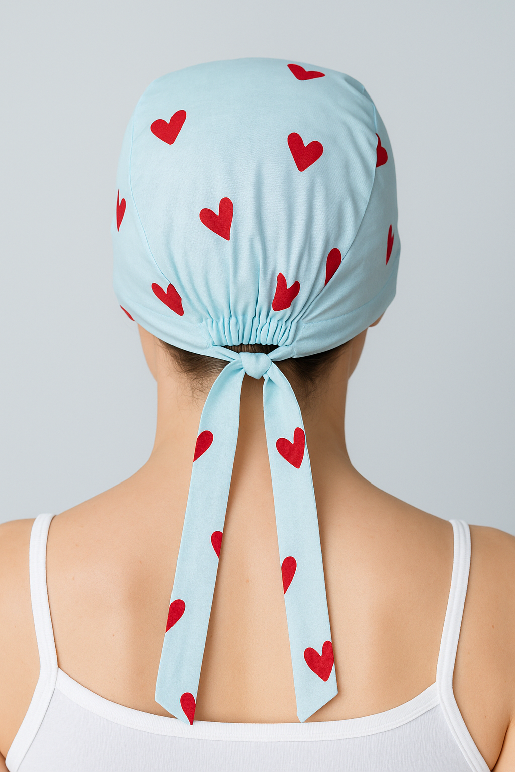 Bu %100 pamuk cerrahi bone, sağlık çalışanlarının yoğun tempolarında maksimum konfor sağlaması için tasarlandı. Yumuşak ve nefes alabilen kumaşı sayesinde başı terletmez, uzun süreli kullanımlarda rahatlık verir. Arka kısmındaki bağlama detayı ile her baş ölçüsüne uyum sağlar. Kalpli desenli tasarımıyla çalışma ortamına enerjik bir dokunuş katar.