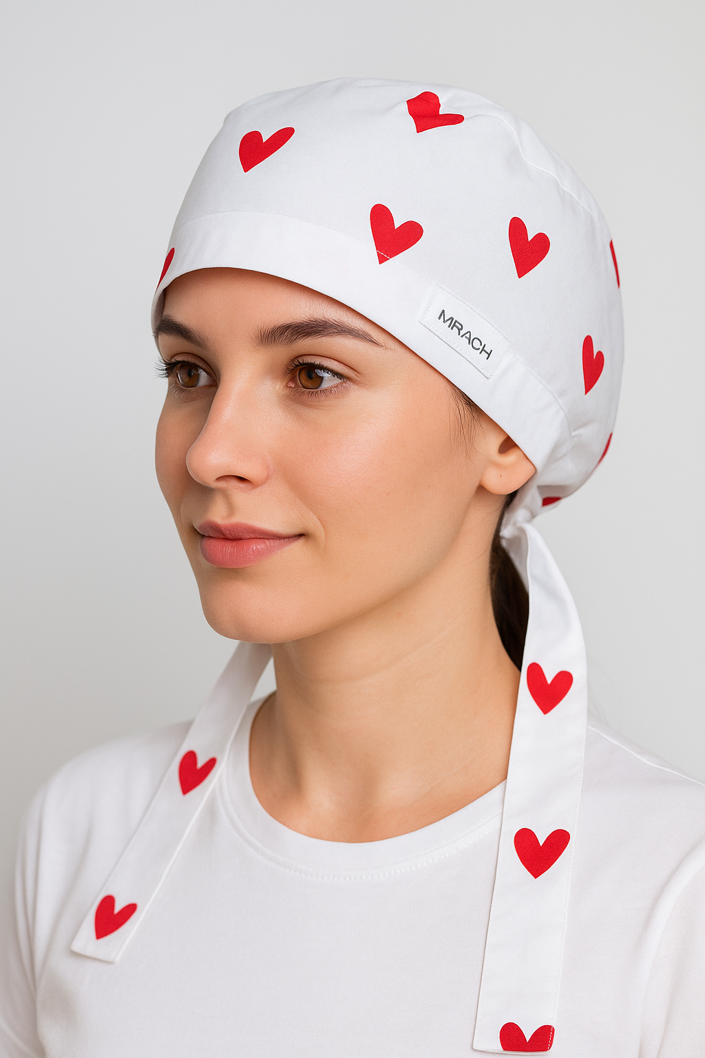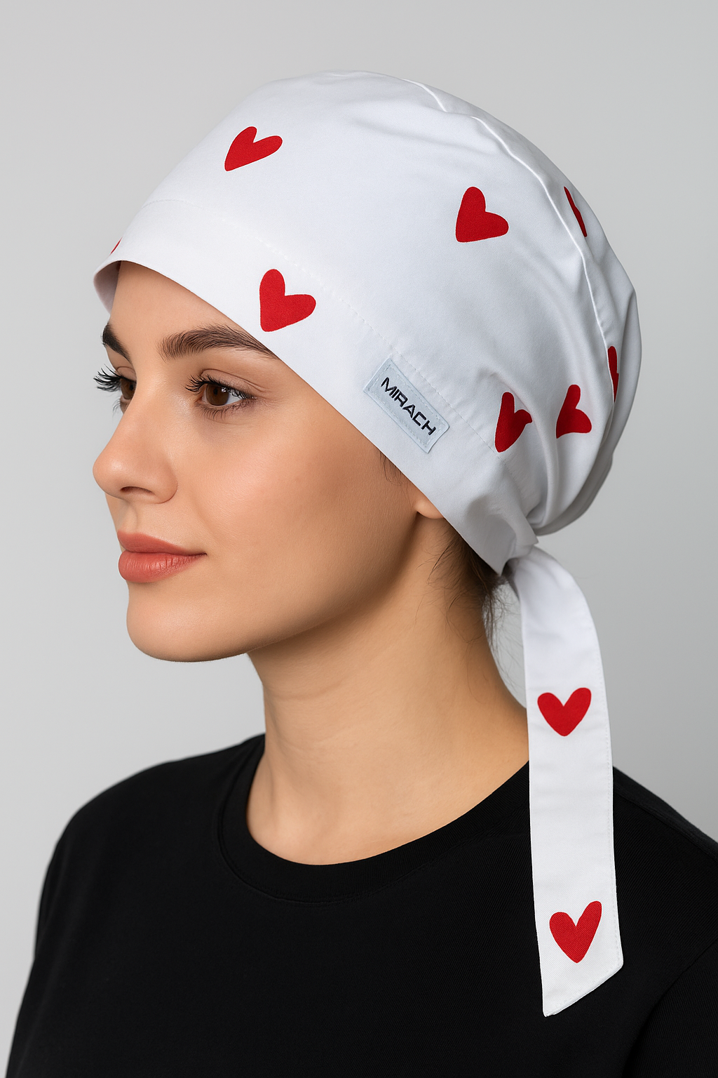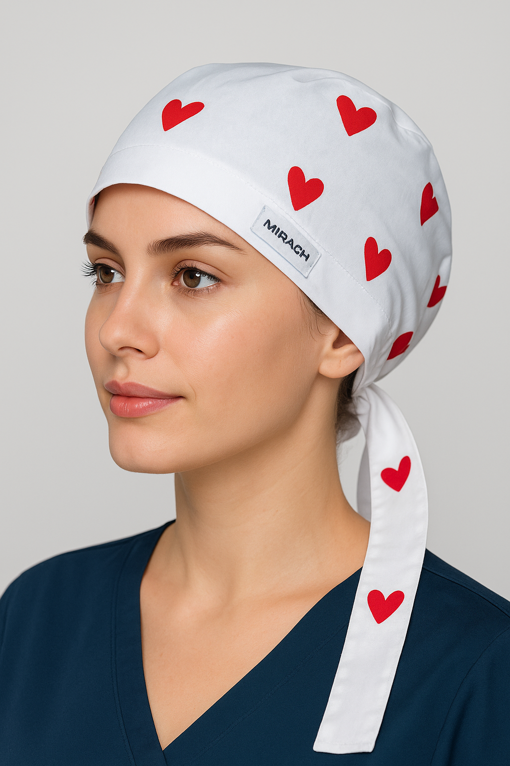 Bu %100 pamuk cerrahi bone, sağlık çalışanlarının yoğun tempolarında maksimum konfor sağlaması için tasarlandı. Yumuşak ve nefes alabilen kumaşı sayesinde başı terletmez, uzun süreli kullanımlarda rahatlık verir. Arka kısmındaki bağlama detayı ile her baş ölçüsüne uyum sağlar. Kalpli desenli tasarımıyla çalışma ortamına enerjik bir dokunuş katar.